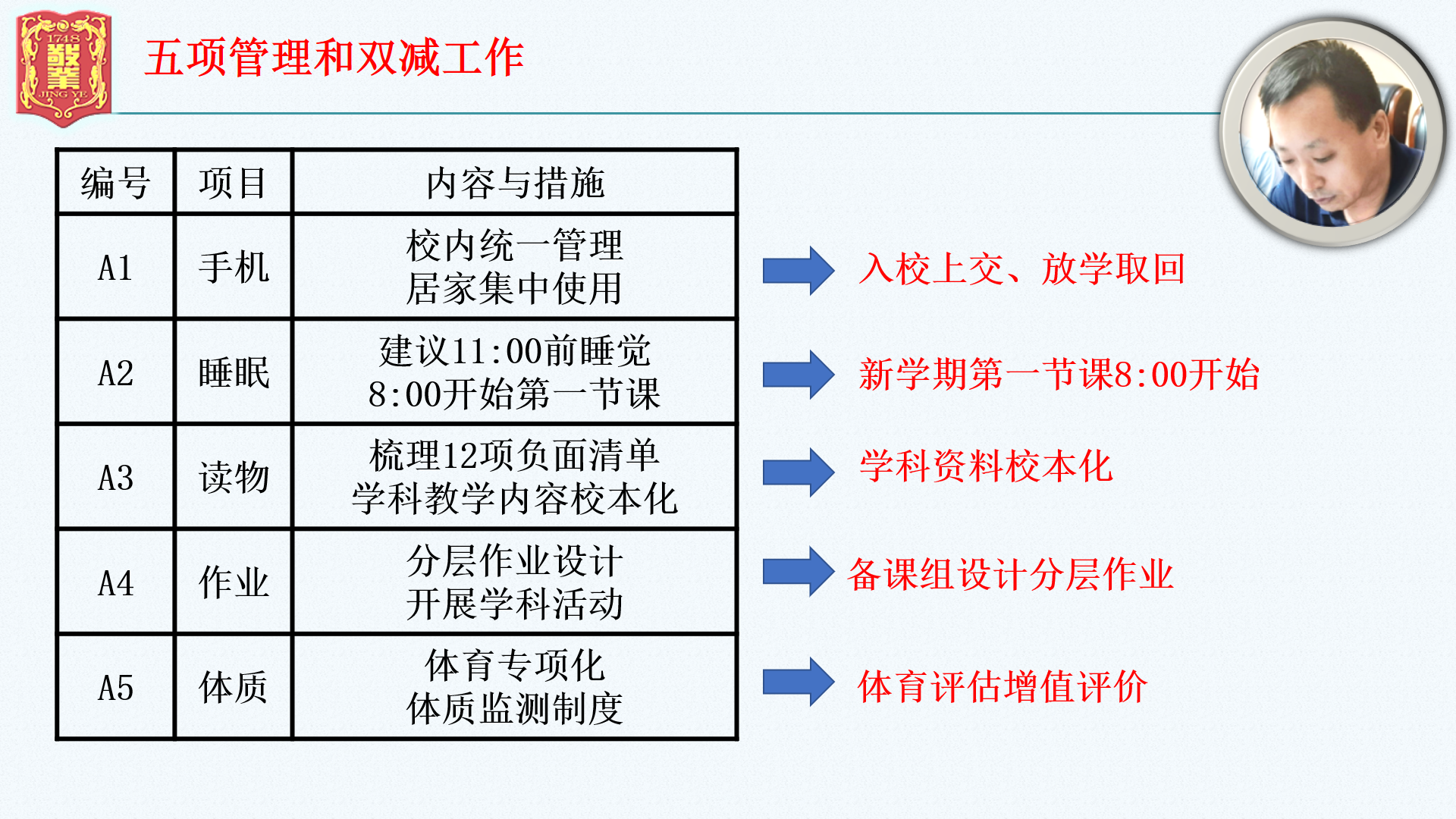 家长会上,教导主任耿令华老师从“聚焦单元设计,推进‘ 双新’实施”“开展分层作业设计,推进校本化实施”“特色学科活动,改善学习方式”三个方面,为家长详细介绍了学校积极落实“五项管理”和“双减”工作要求。