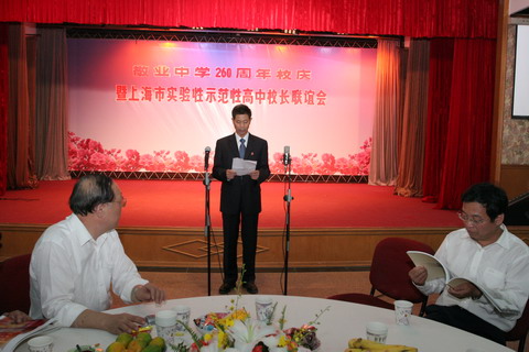 2008年10月8日下午,为了庆祝上海市敬业中学建校260周年,上海市实验性示范性高中校长们在敬业中学多功能厅举行了联谊活动。与会的校长们纷纷向上海这所历史最悠久的名校表示祝贺,同时也对敬业中学能够长期致力于学校历史文化传承与创新称赞不已。郑大中校长代表学校感谢市区领导和兄弟学校对学校教育工作的关怀和支持。活动由上海市实验性示范性高中校长联谊会王志刚会长主持,市教委基教处颜慧芬副处长、市教委人事处俞玲萍副处长、市督导室孙鸿副主任、区教育局曹跟林副局长、市教育协会许象国秘书长、上海市实验性示范性高中校长联谊会仇忠海副会长等领导出席了此次活动。