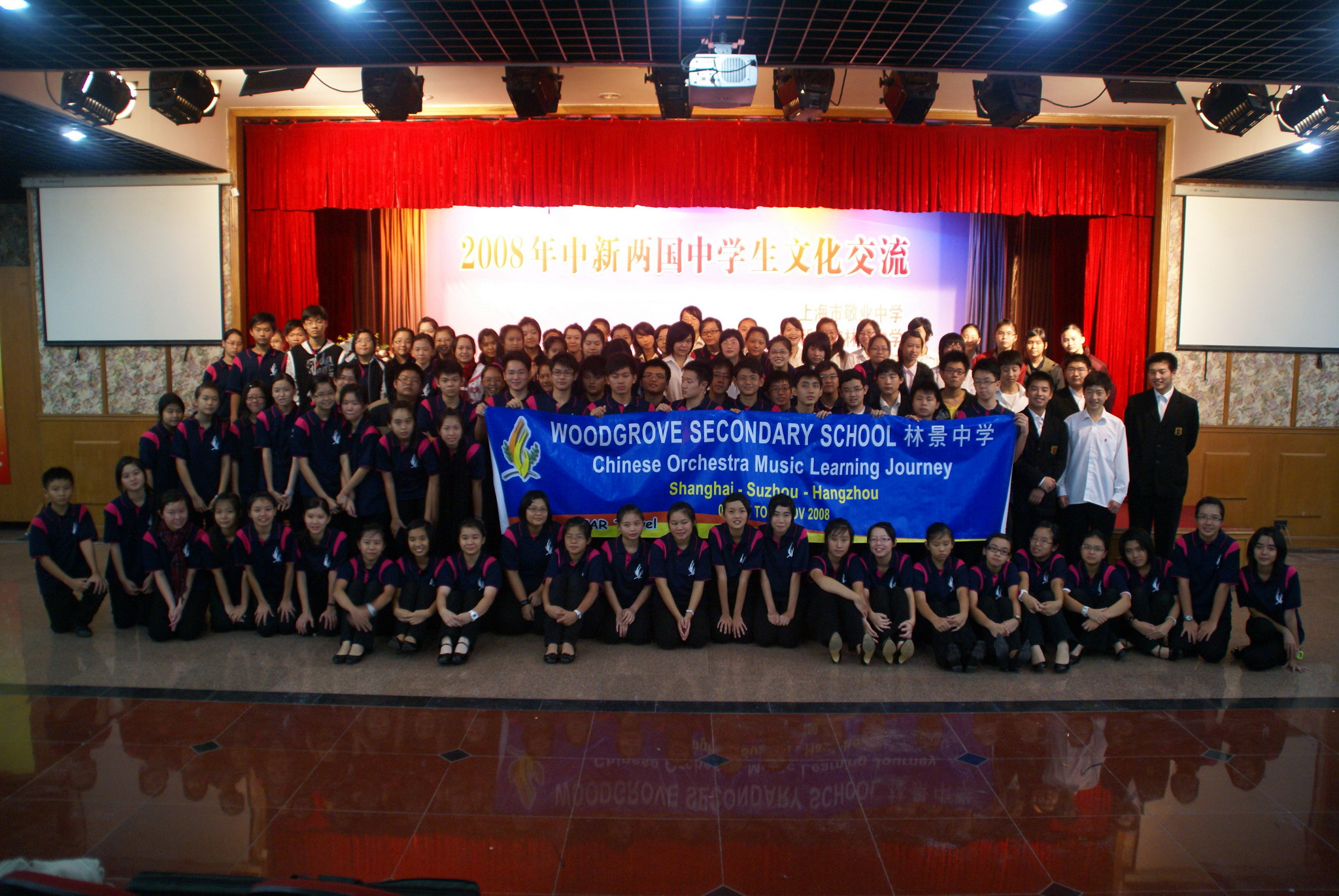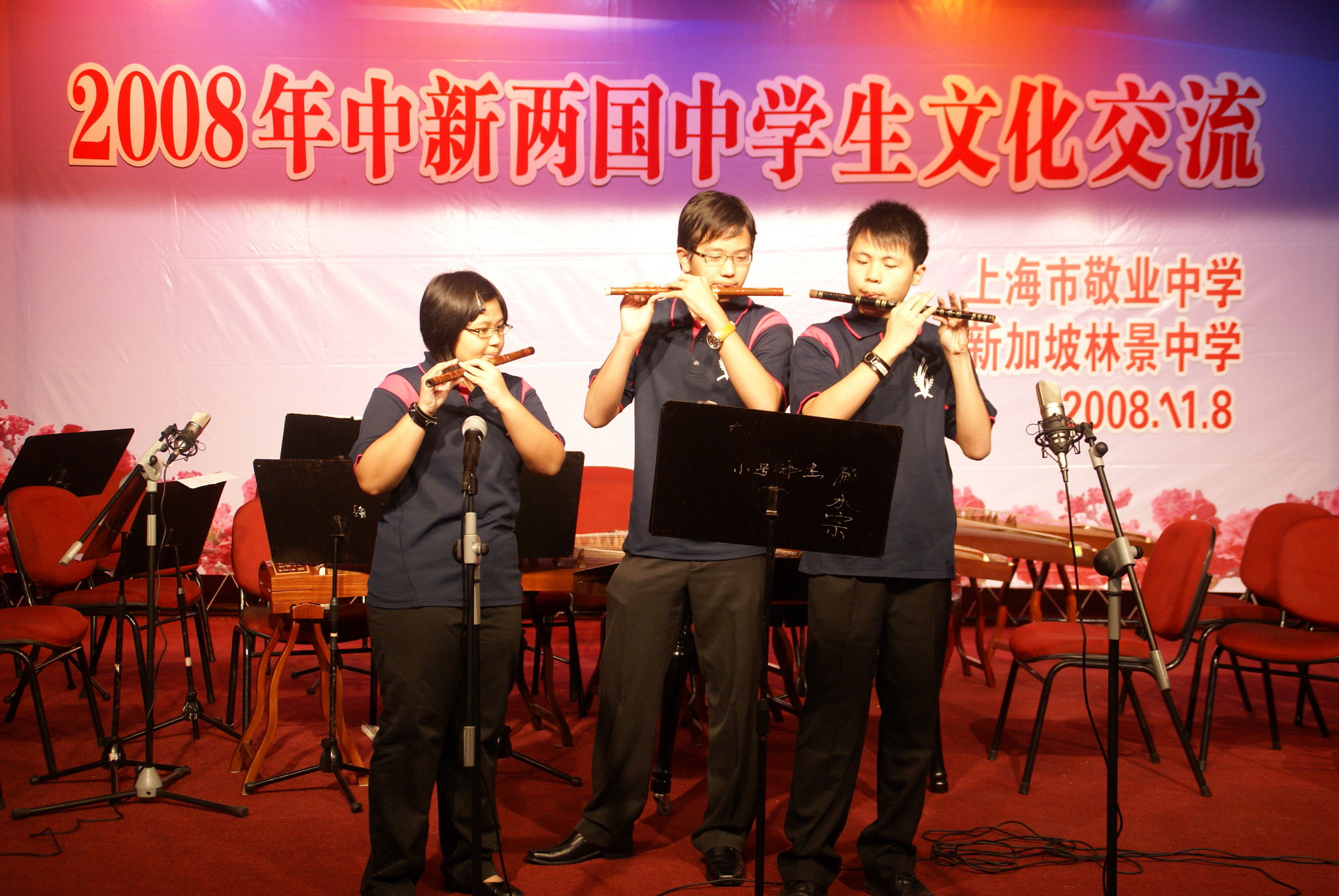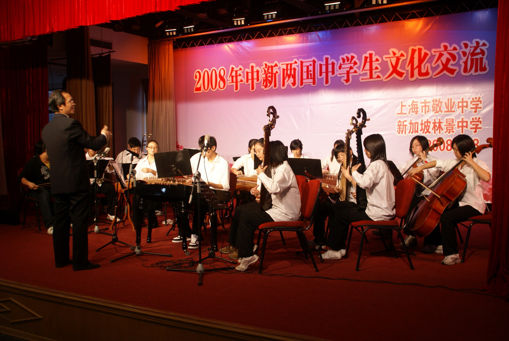 演出前郑大中校长和新加坡林景中学华乐团领队翁玲玲女士代表各自学校上台发言并互赠了纪念品,双方领导都表示希望能经常举办类似的活动,加强文化交流,增进两校友谊。随后在我校的民乐队优美的《茉莉花》中拉开了交流演出的序幕,欢快的《花好月圆》传递了大家欢迎远道而来朋友们的喜悦心情。接下来大提琴、琵琶、扬琴、笛子、唢呐等乐器演奏节目一一登台,音乐为两国学生搭建起沟通的桥梁,精彩的表演赢得了阵阵的掌声。表演结束之后,同学们又继续相互切磋琴技、交换小礼物,共同合影留念,将灿烂的笑容定格,永远的留在记忆中,08年中新两国文化交流演出活动也就此圆满的拉下了帷幕。
