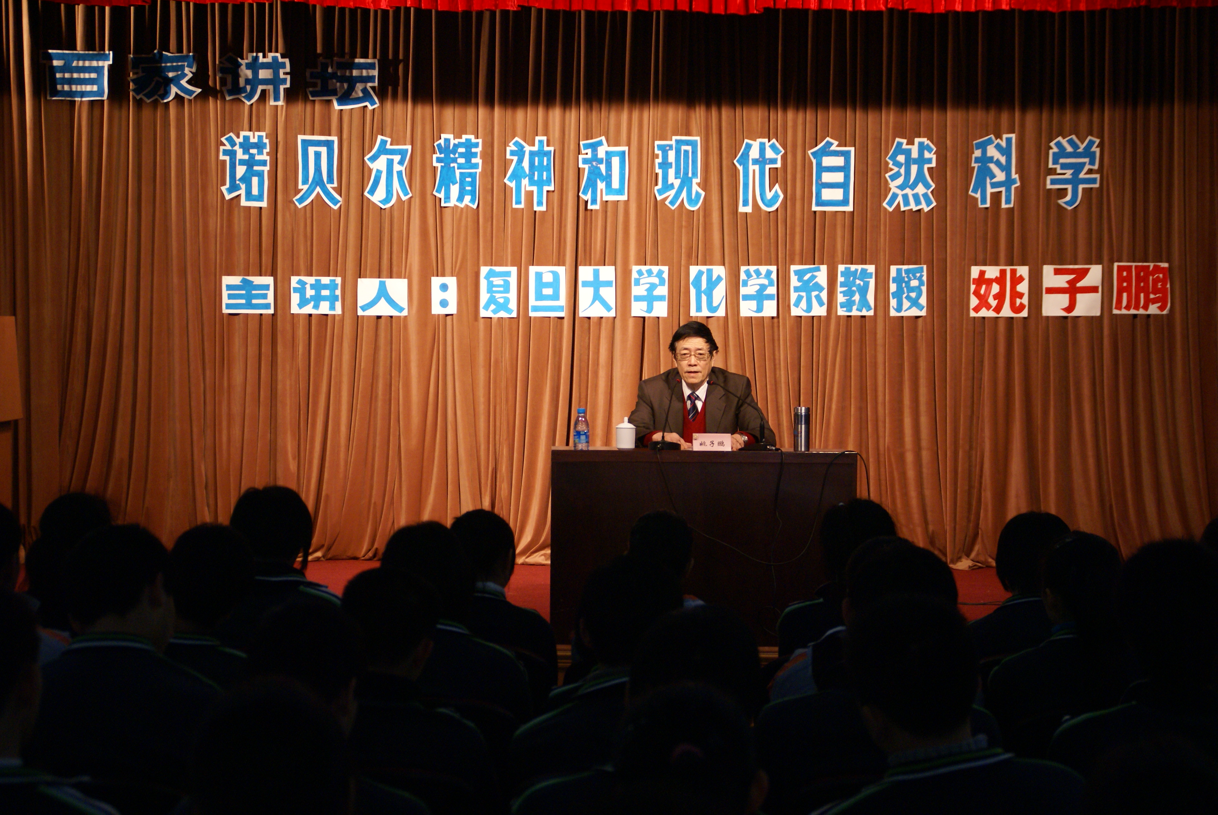 2008年11月21日下午,复旦大学化学系教授、化学新课改教材主编姚子鹏教授应邀来到我校,为全校师生做了一场题为《诺贝尔精神和现代自然科学》的报告。报告中,姚教授以一个个生动的故事和富有教育意义的事例教导学生,要向诺贝尔先生学习,努力培养自己善于发现、勤于专研、勇于探索的科学精神,做一个有创新精神、脚踏实地的新时代接班人。姚教授的精彩报告深深吸引了广大的师生,大家感到受益匪浅,纷纷表示希望《百家讲坛》这个敬业的传统活动能够继续办下去,而且越办越丰富,越办越精彩。