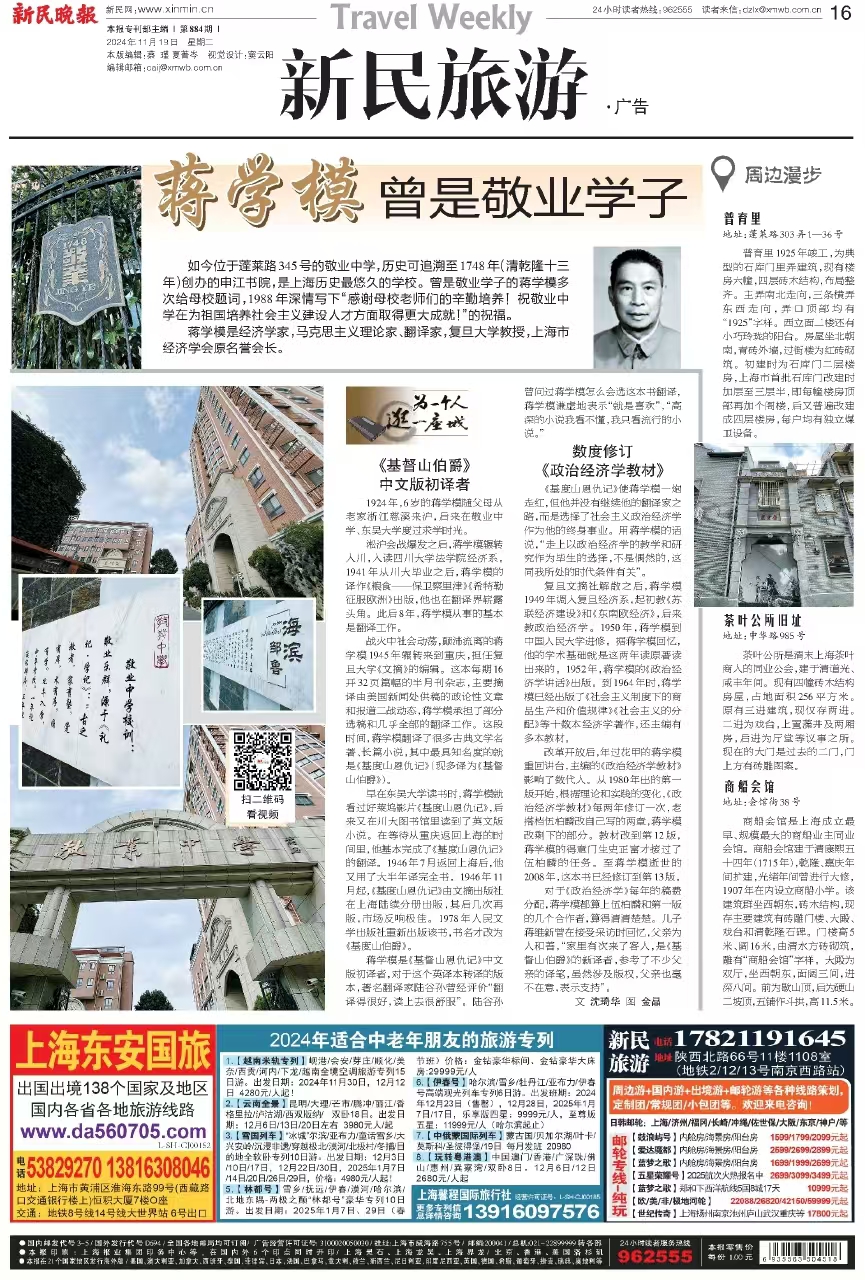 2024年11月19日,《新民晚报》16版,刊登了我校蒋学模校友的事迹。