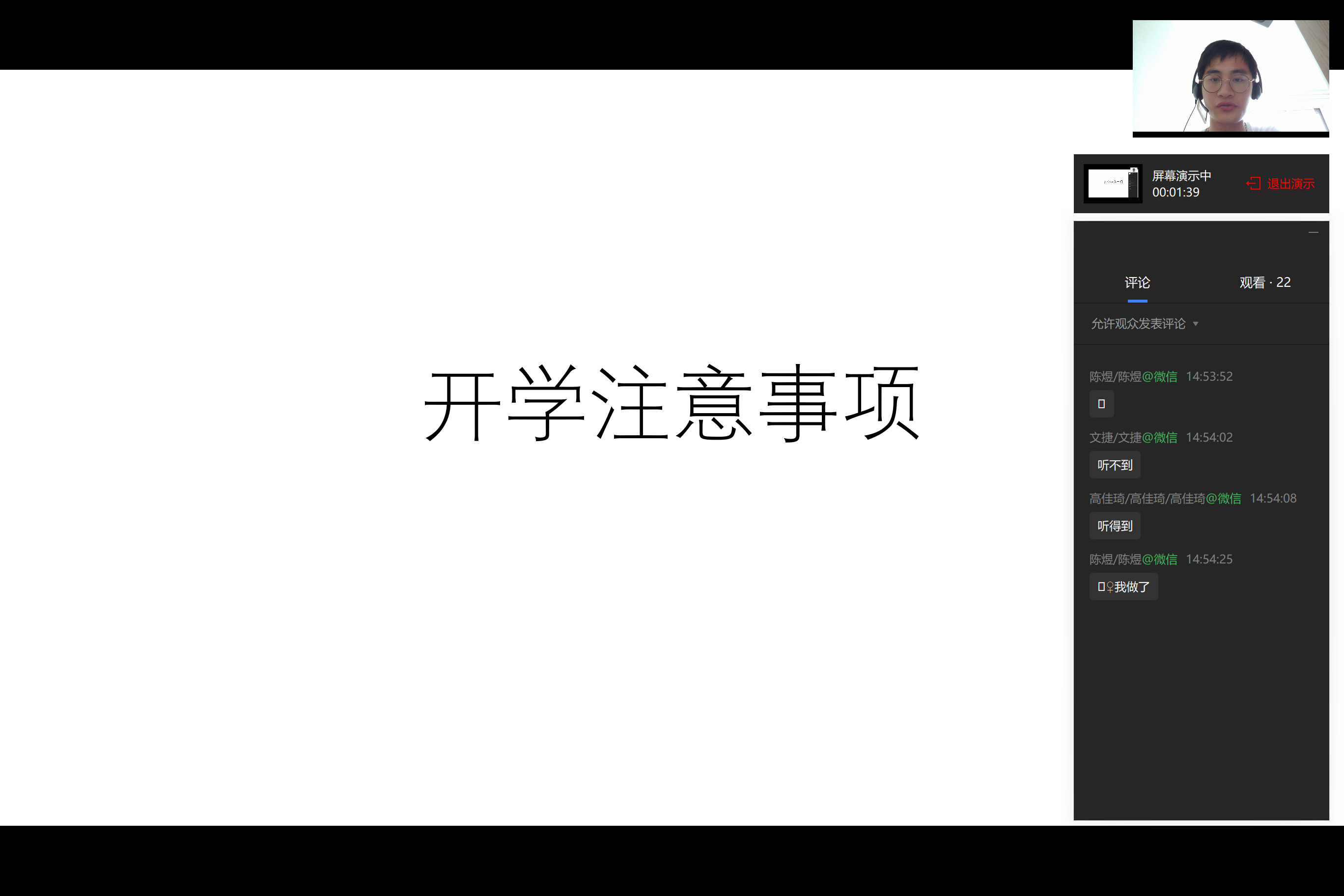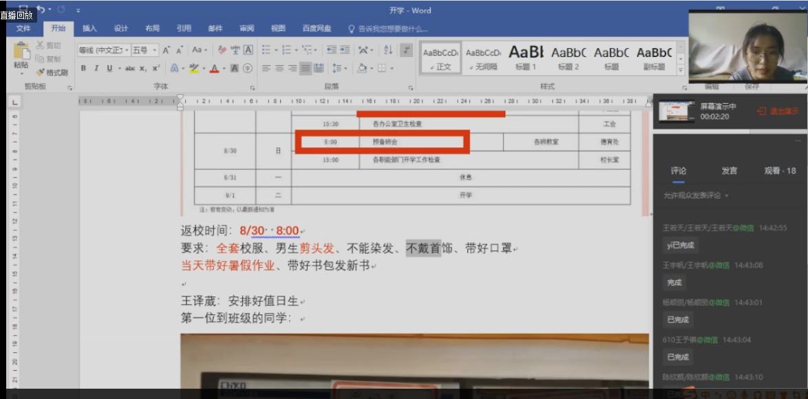 随后,各班班主任老师根据本班特点,进行在线主题班会。回顾并暑假期间班级活动的开展情况与成果,根据市区文件精神从疫情防控、个人健康管理等方面提出要求和指导。此外,就新学期、新年级即将面对的挑战与变化,班主任老师还给予了同学们心理与学习相关建议,以便于学生做好开学的身心准备,以良好的状态迎接新学期。