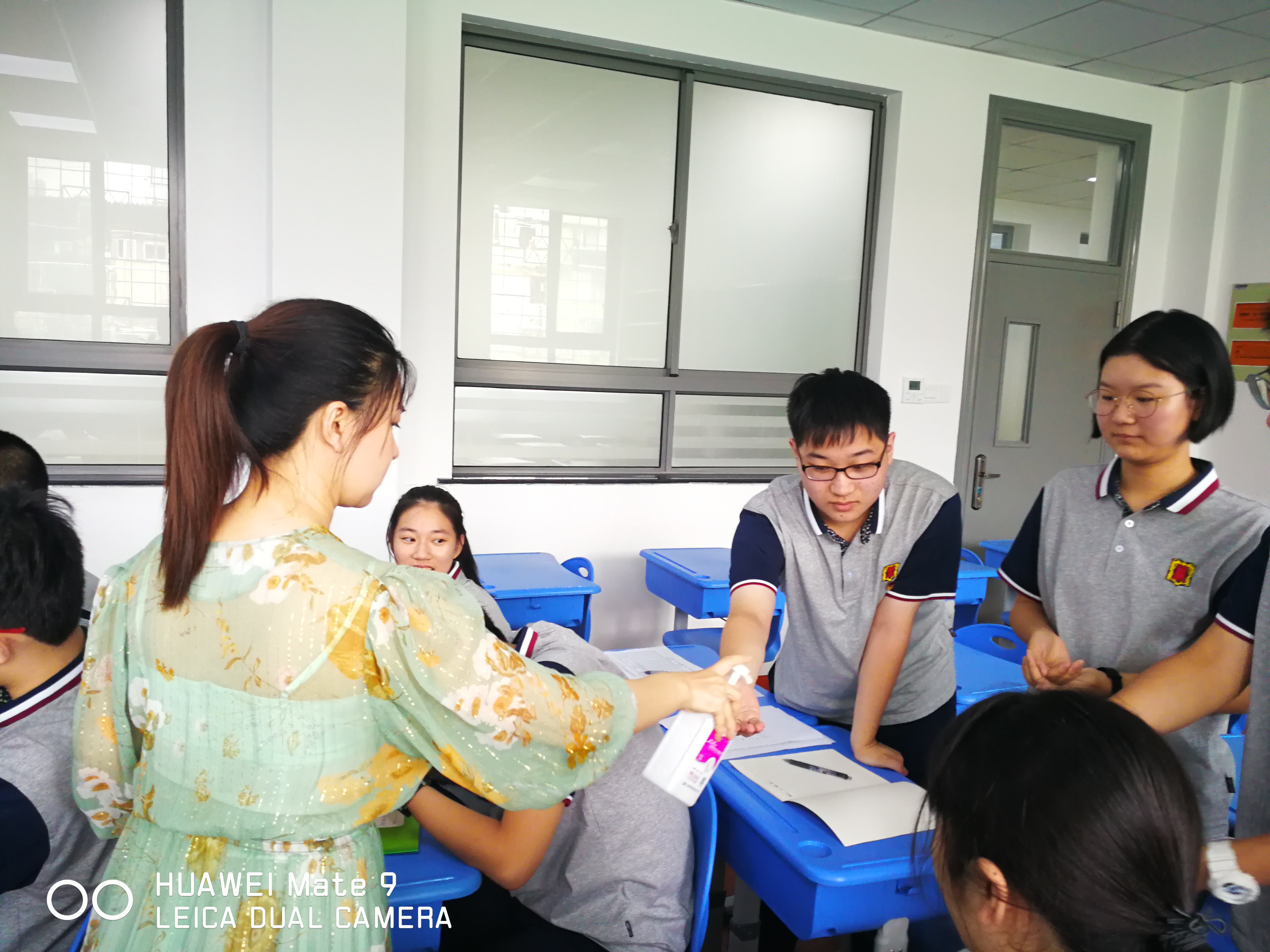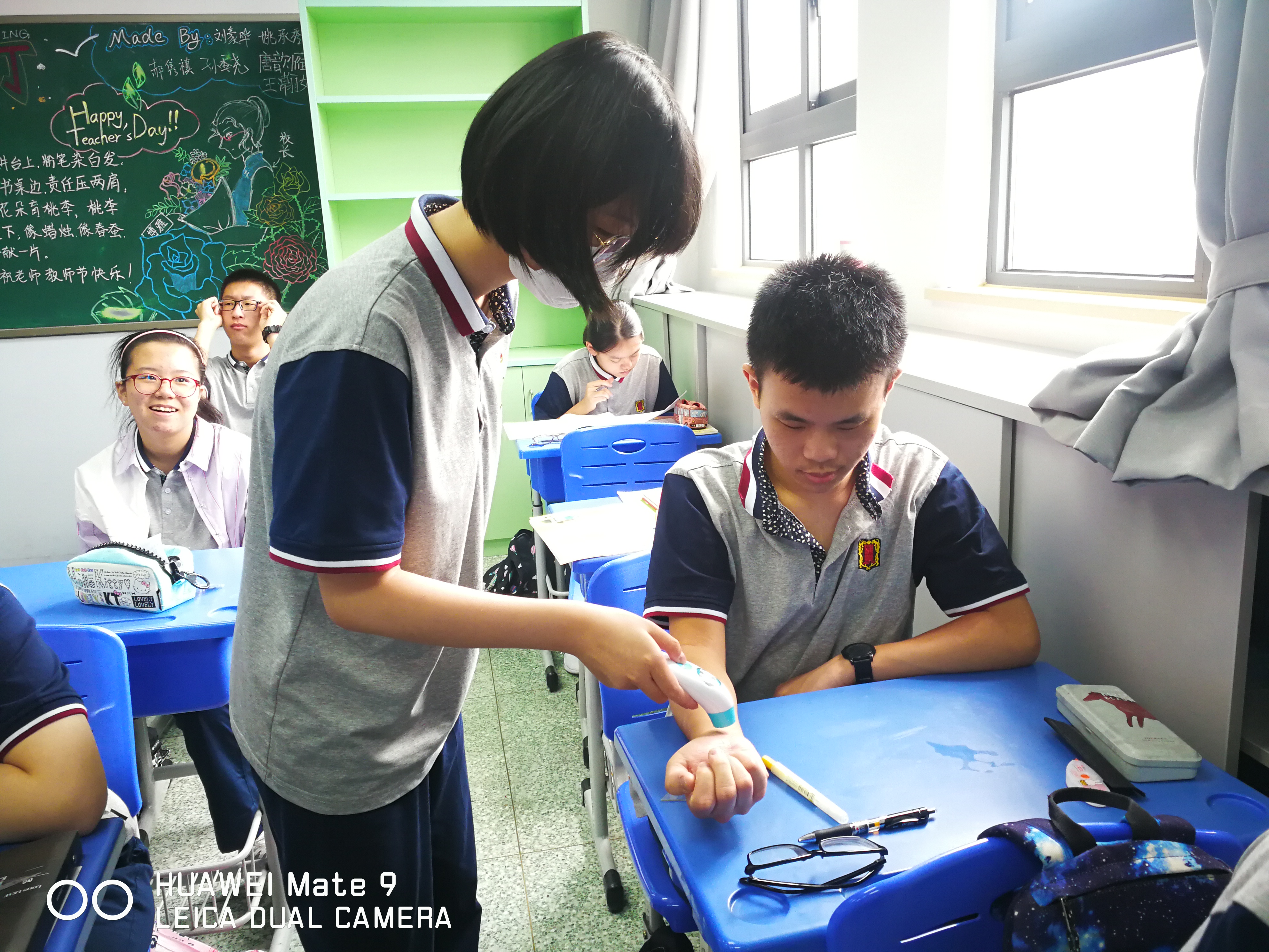 在学校防疫方面,王老师先介绍了学校防疫各项制度,说明了班级防疫要求。每个班级配置测温枪的用途,提出了规范的使用及放置要求,并给同学们示范了测温枪的正确使用方法及注意事项和需要卫生员测温的场合等事宜。就学生呕吐、发热等突发应急情况,王老师强调了卫生员们正确的处理流程,包括将同学送至卫生室,告知班主任,呕吐时配合在场老师指导同学迅速分散周围同学带离教室等。