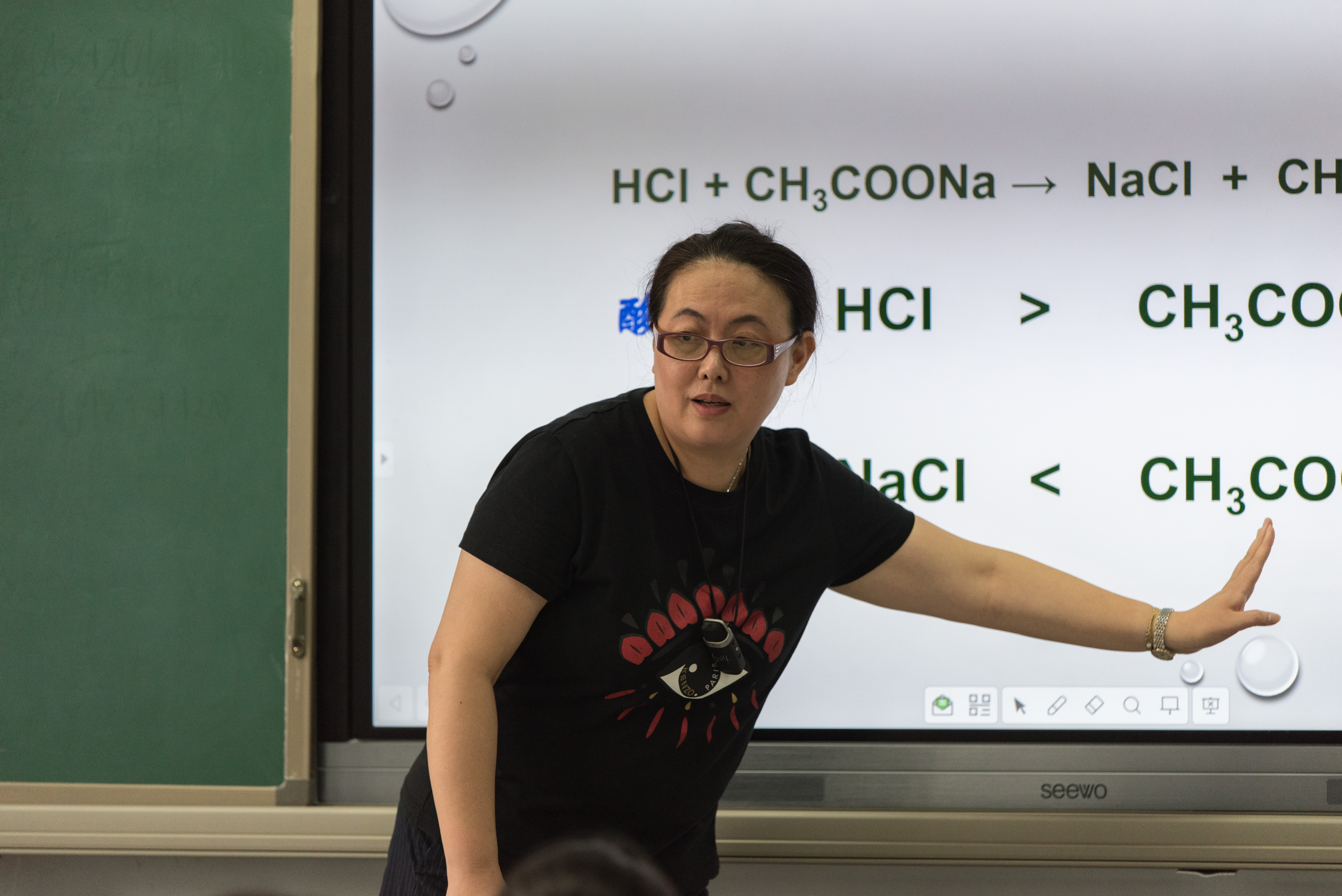 调研活动以荣凤娜老师的《化学反应中的“以强制弱”规律》一课拉开序幕,荣老师用“通过互滴,对两瓶无色溶液鉴别”的情境作为切入,运用“以强制弱”规律,发掘用于判断离子反应方向及产物的“对角规律”,巧妙突破了陌生离子反应书写、反应程度判断这一难点,获得了三位专家及听课教师的一致肯定,夏向东老师点评说,本课内容针对性强,逻辑清晰易理解,使学生在复杂化学反应的书写过程中,变得有章可循,消除了学习障碍。