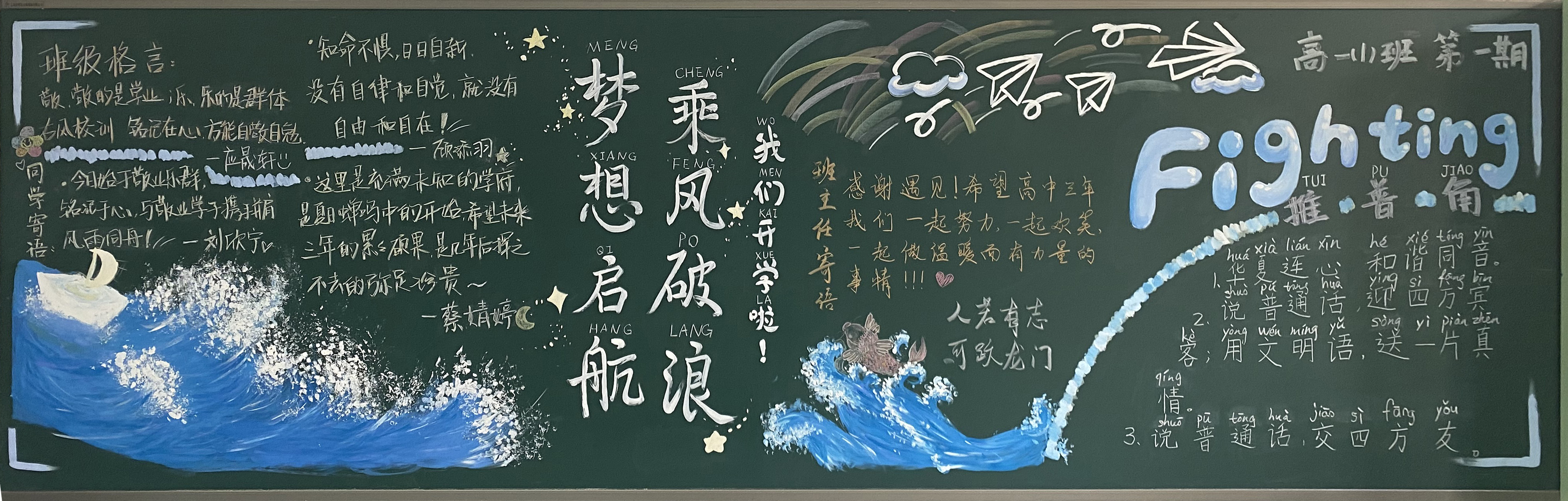 高一1班的板报在传统的大主题中加入了个性化的创新,不仅有班级格言的撰写,还有班级寄语,“梦想起航,乘风破浪”的标题紧贴新时代脉搏。