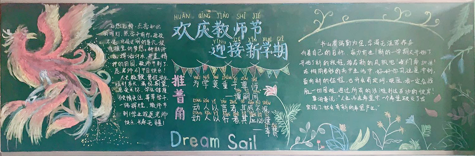 长夏逝去,凉秋悄然。八月,再见了,九月,你好啊。在这个感恩的季节里,敬业中学迎来了新的学期和第36个教师节。为庆祝教师节的到来,培养学生良好的思想道德情操,营造尊师重教的班级文化氛围,学校在开学伊始开展了“迎接新学期,感恩教师节”的板报评比活动。