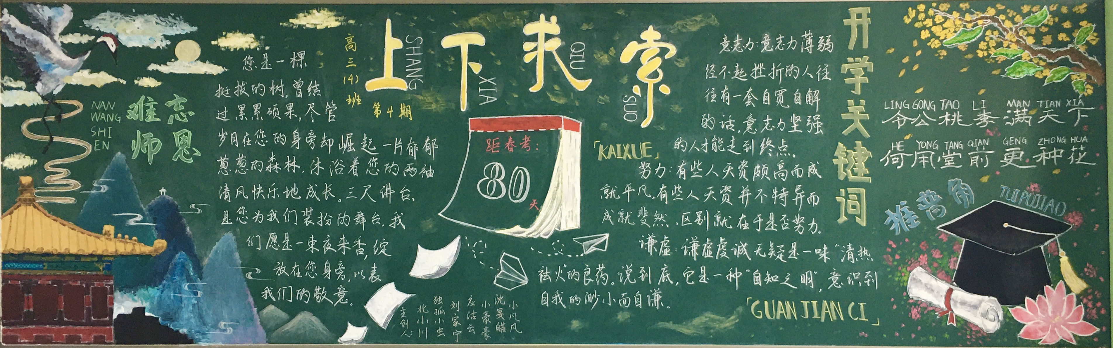 高三4班的板报融入了中国传统元素,仙鹤、庙宇、群山为板报带来了古典意韵。“上下求索”的标题与春考倒计时的日历彰显了高三学子的特色与期望,板报言有尽而意无穷。