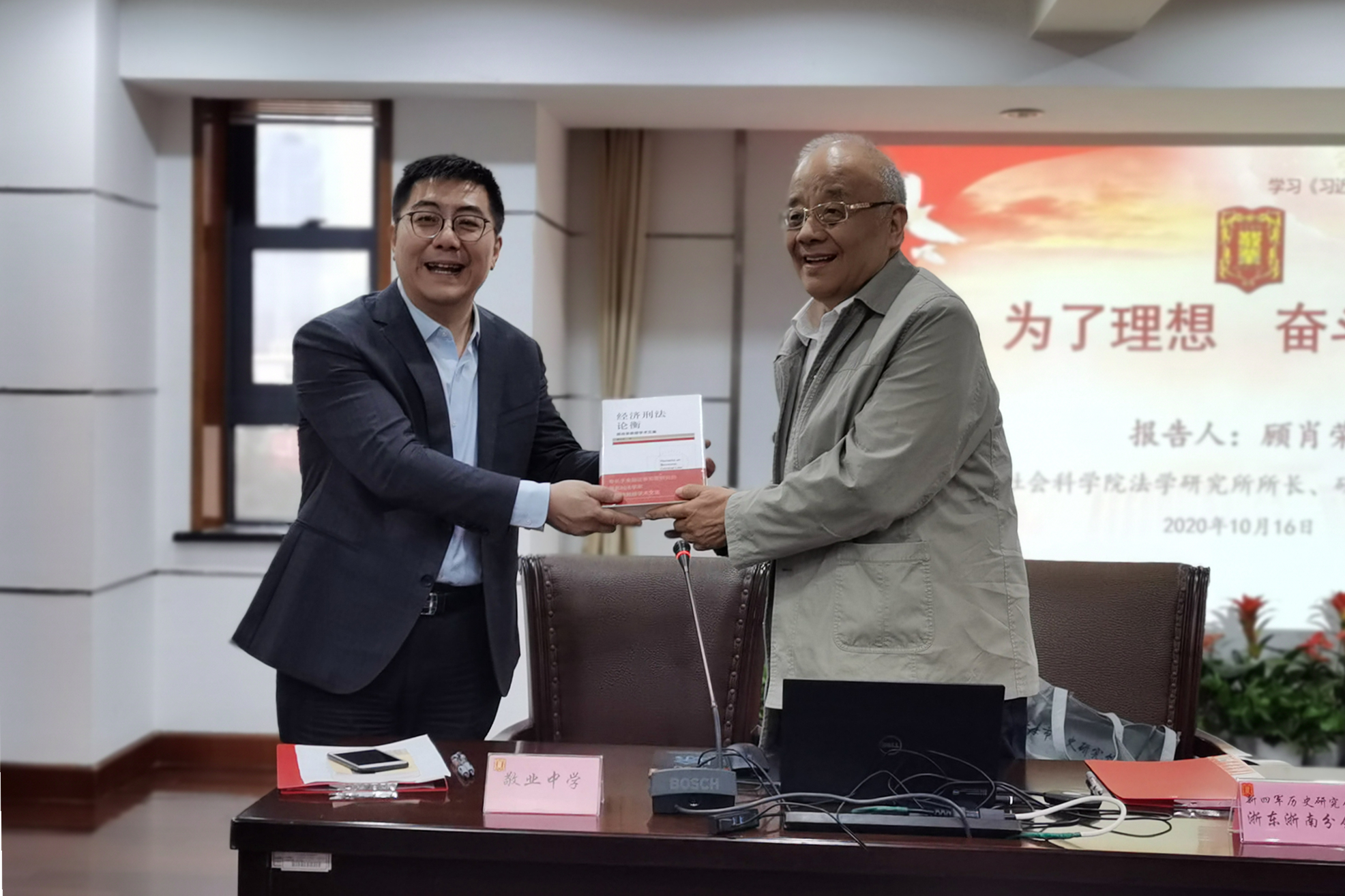签约仪式后,由上海市新四军历史研究会浙东浙南分会成员、原上海社会科学院法学所研究员、上海市文史研究馆馆员顾肖荣作了题为《为了理想 奋斗终身》的讲座。顾先生分享了在抗日烽火中从上海南方中学(敬业中学前身)走出来的29人学生党员队伍的英勇事迹,他们大多十六七岁时投笔从戎,参加新四军或抗日游击队,投身于抗日救亡和中国人民的解放事业,有好几位烈士牺牲时年仅19岁。顾肖荣老先生的父亲顾渊(顾秋石)也是29位学生党员队伍中的一员,顾先生谈到父亲经常讲述战争年代校友们的革命事迹,现场追溯分享了父亲与南方中学老同学老战友李国瑾、张英、乔石昔日的峥嵘岁月。