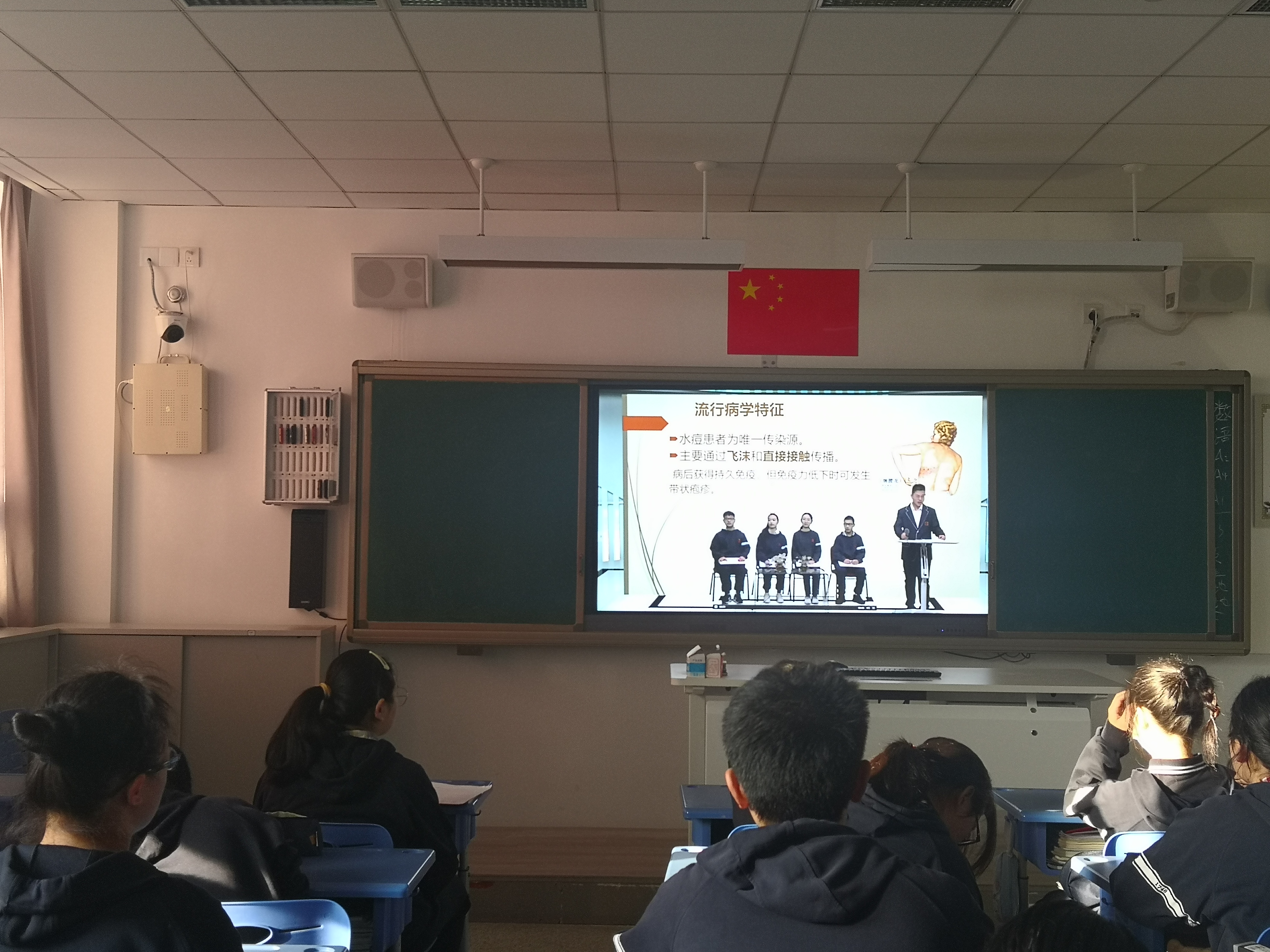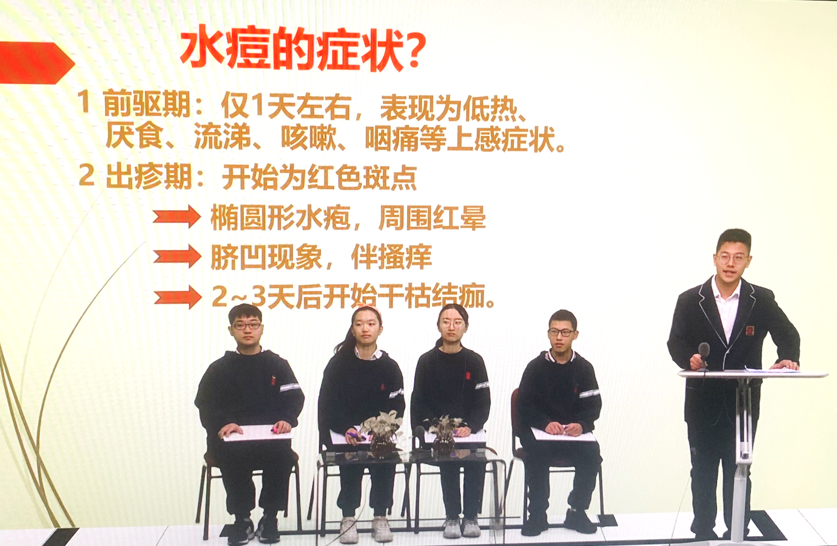 2023届8班的郑凯泽同学作为主持人,为全校同学简要介绍了秋冬季传染性疾病水痘以及诺如病毒的症状、传播途径和预防措施,为同学们预防近视提出了有效可行的防控方法。2023届4班曹晟、2023届8班沈逸轩、2023届4班薛贝嘉,以及2021届4班杨海斐四位同学作为学生代表,参加这次以问答题、选择题和填空题等题型为主的互动环节。台上台下的互动、屏幕前后的互动、教室里师生的互动,特别的形式吸引了收看师生的高度关注,提高了同学们对传染性疾病和青少年近视预防的有效认识。