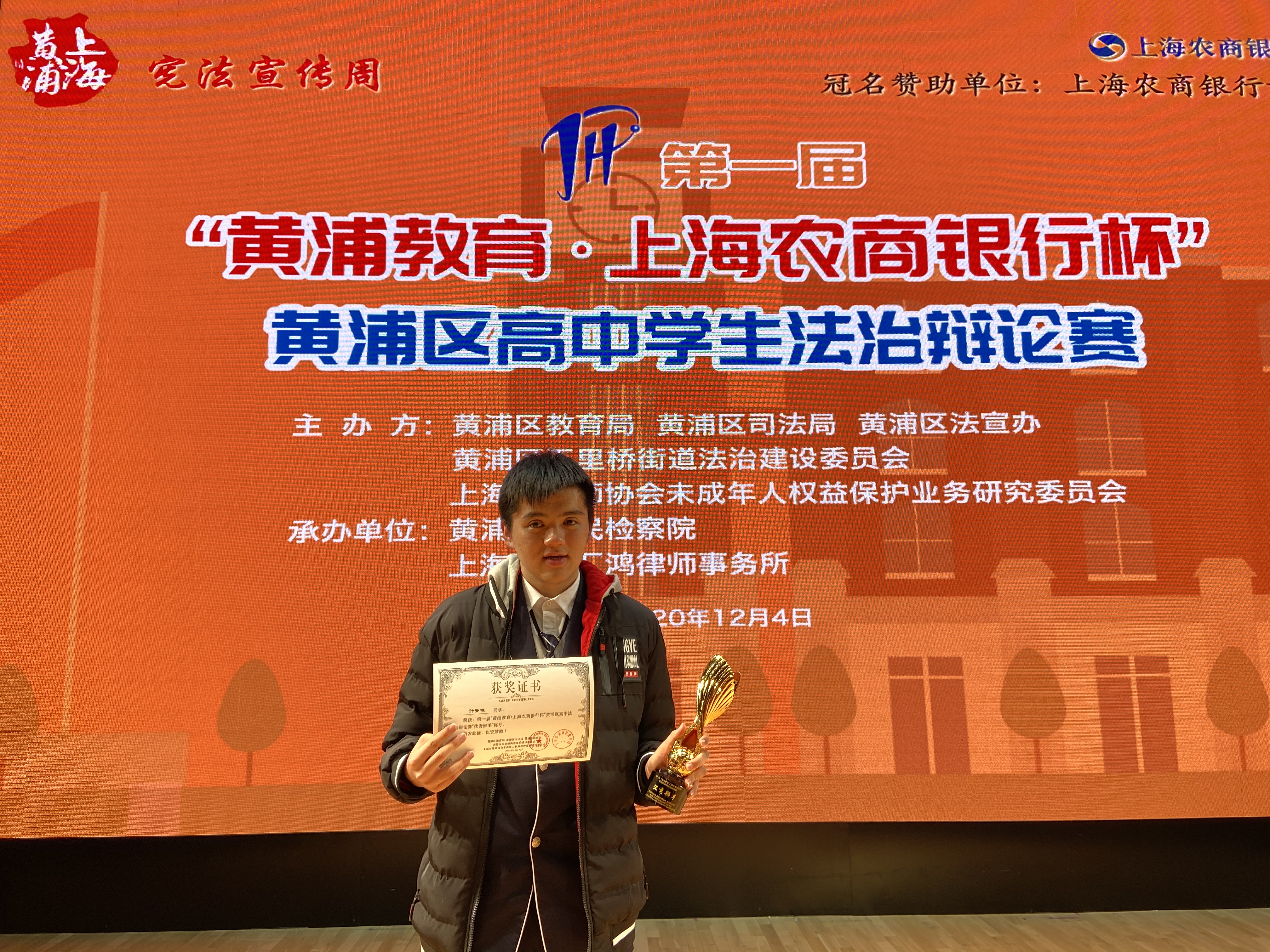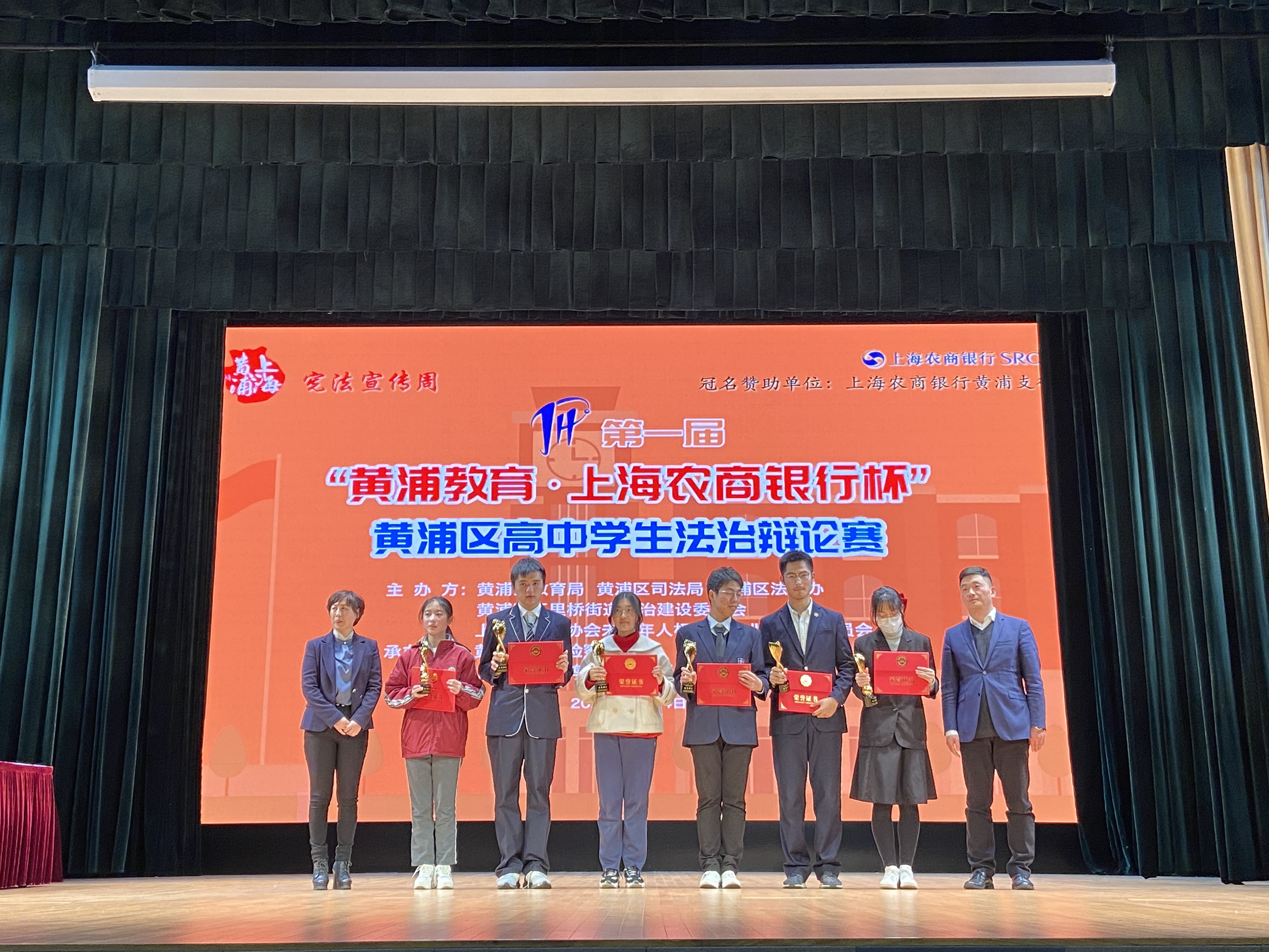 12月4日,黄浦区第一届“黄浦教育 农商银行杯”高中生法治辩论赛颁奖仪式在五里桥社区文化活动中心举行。我校辩论队荣获本届比赛优秀辩论队三等奖,我校高二5班的计云樵同学荣获最佳辩手。