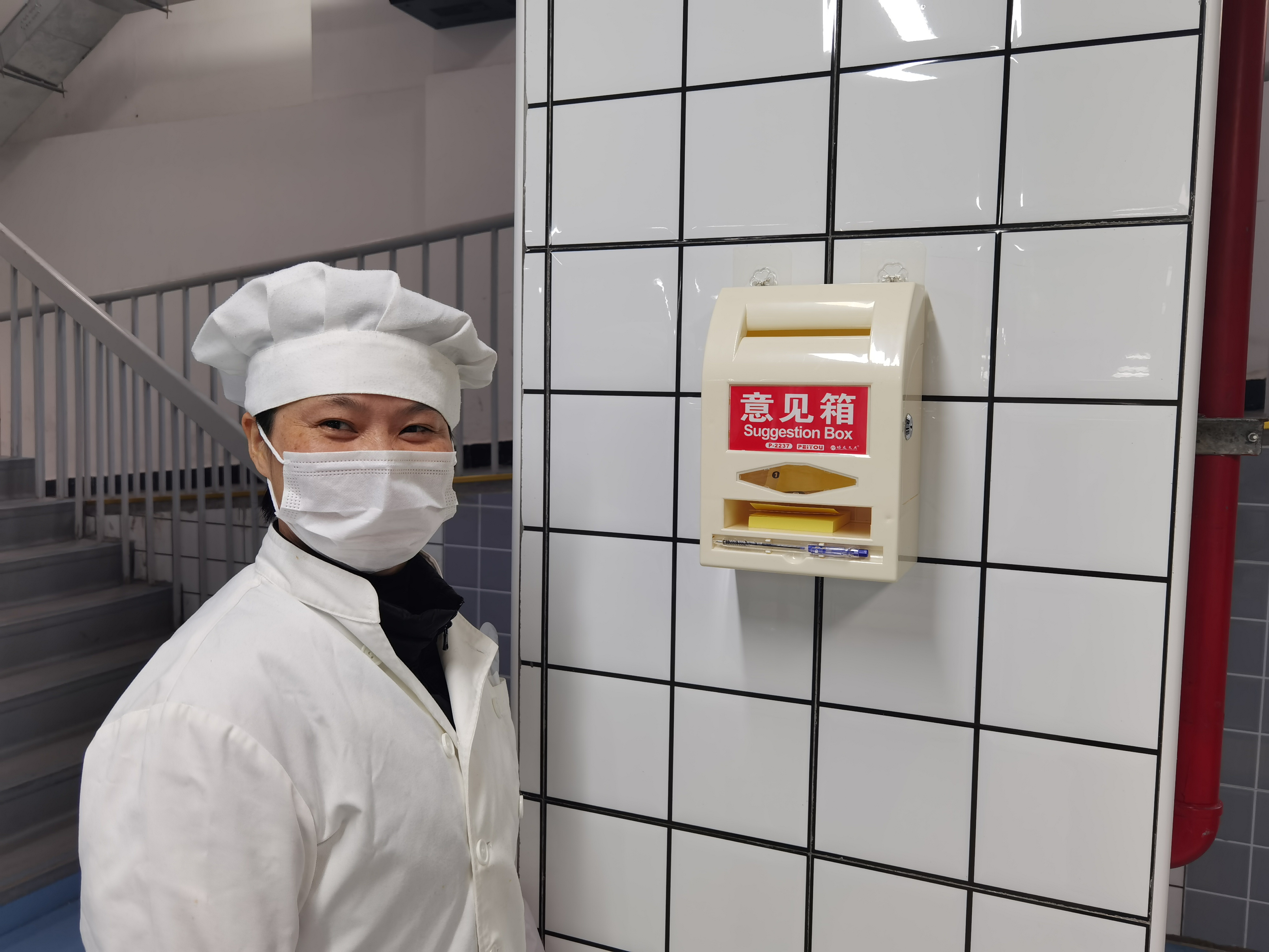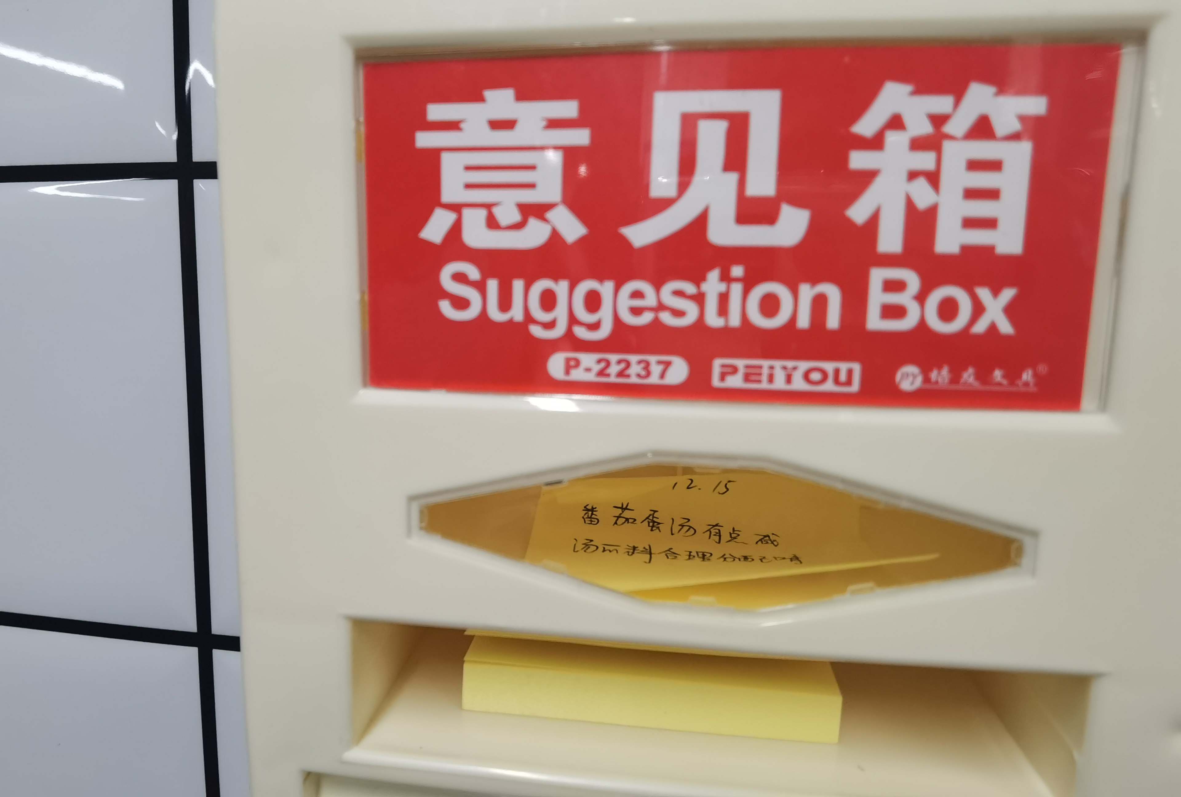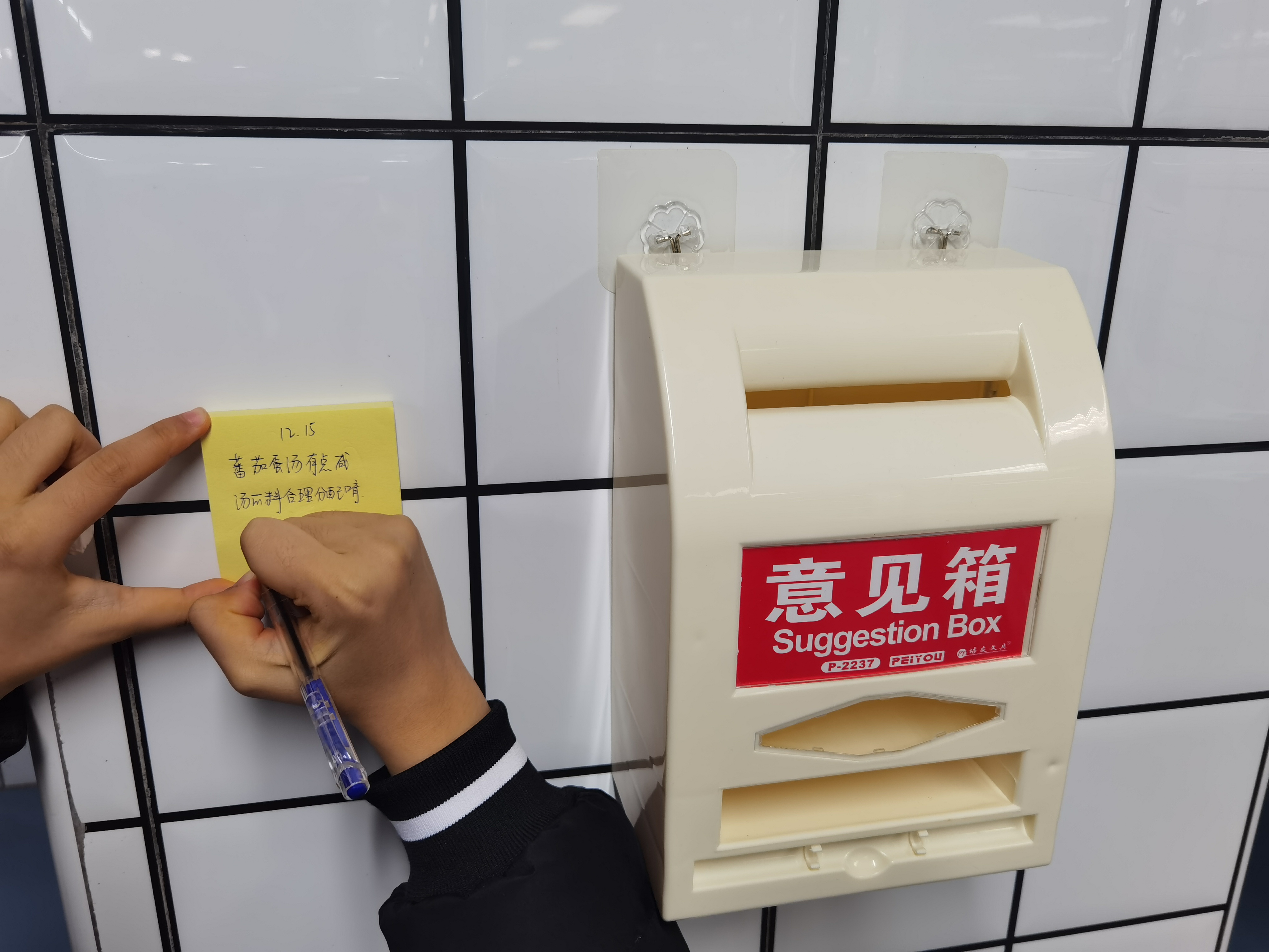 早在本学期的11月,各班的膳食员召开的座谈会上,同学们就食堂午餐的意见进行了讨论。经讨论商议决定——学校食堂开设首个食堂意见箱,同学们可以通过意见箱,向学校食堂反馈自己的意见与想法。如果大家有对当日的菜品不满意的地方、有想要吃的菜式、或者当天哪个菜烧得特别美味,都可以在便签纸上写下日期与想法,投入意见箱进行反馈。