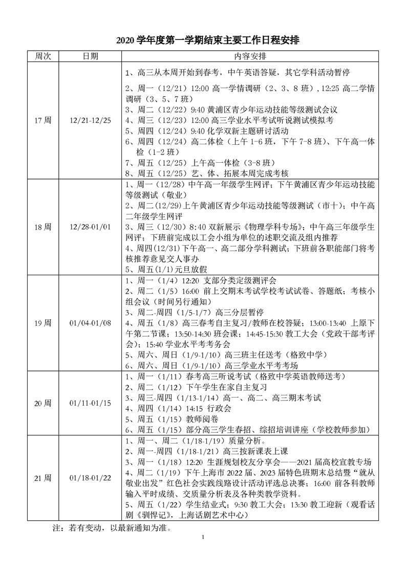 2020学年度第一学期结束主要工作日程安排-九游会国际