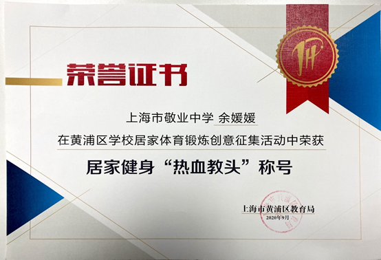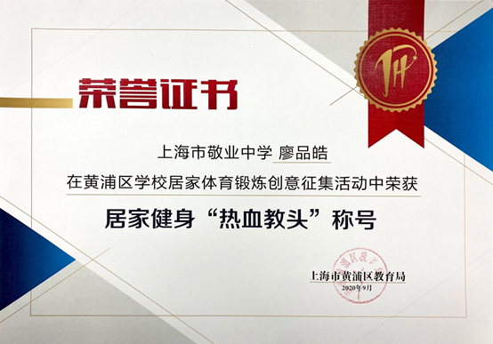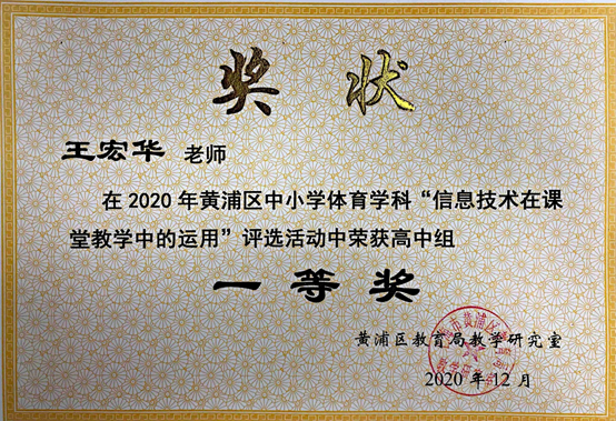 10月30日,疫情常态化背景下,我校体育组三位老师将自制网课视频重新整理完善并投稿参赛,其中王宏华、余媛媛两位老师参与黄浦区中小学体育教师“信息技术在课堂教学中的运用”征集与评选比赛,分获一等奖和三等奖;余媛媛、廖品皓两位老师在黄浦区学校居家体育锻炼创意征集活动中荣获居家健身“热血教头”称号。