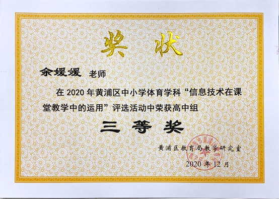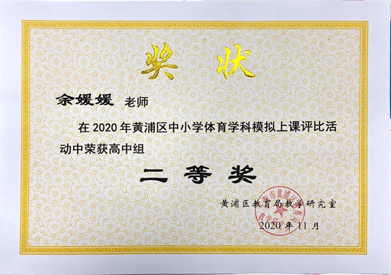 11月23日,我校余媛媛老师积极参与黄浦区中小学体育学科模拟上课比赛,并在最终的评比活动中荣获高中组二等奖。