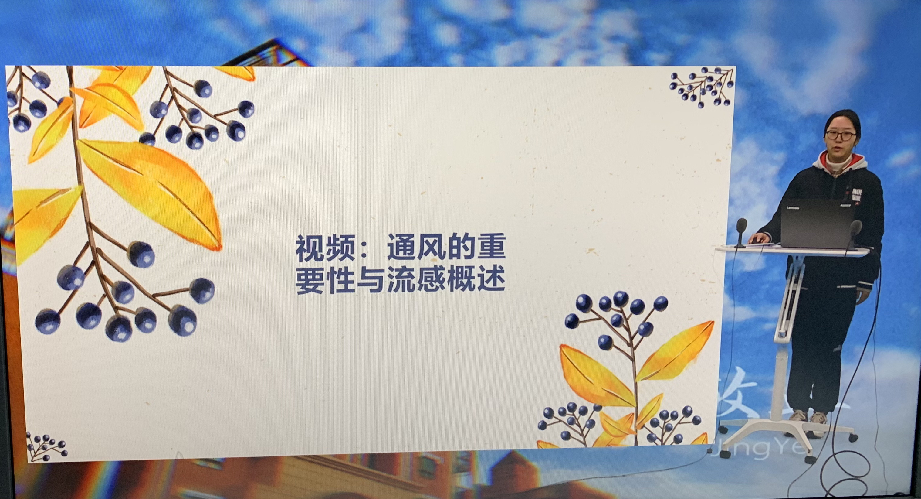 主持人为同学们播放了两个短视频:通风的重要性与流感概述。经常开窗通风,可以有效地利用阳光和空气中的紫外线杀死病菌,清除室内空气中的有害气体,净化空气。在凛冽的寒冬,流感肆虐,勤通风可以提高身体的免疫力,减少呼吸道疾病。