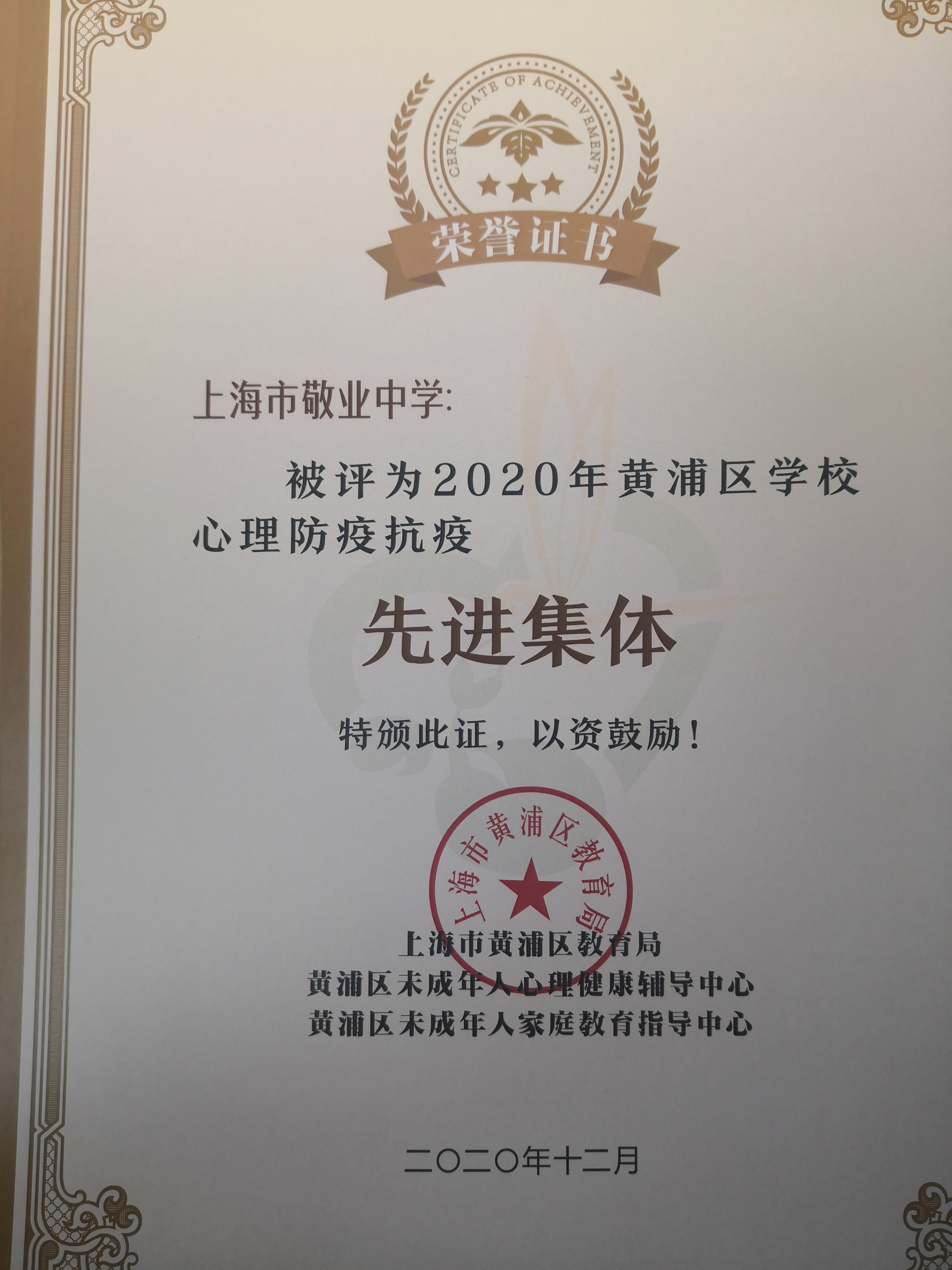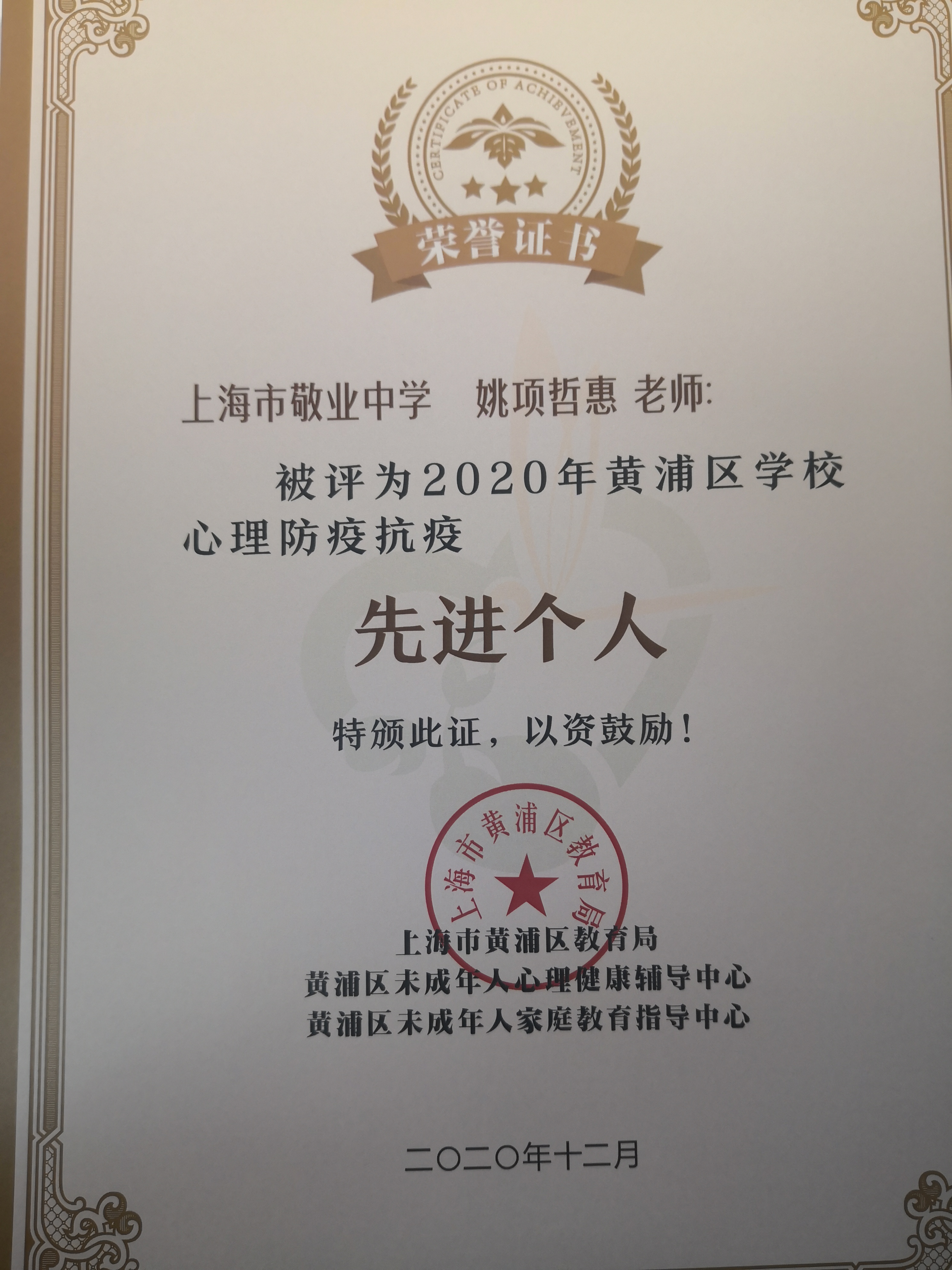 一系列工作受到肯定,我校获“2020年黄浦区学校心理防疫抗疫先进集体”,我校心理教师姚项哲惠获“2020年黄浦区学校心理防疫抗疫先进个人”。