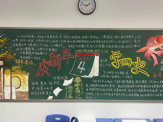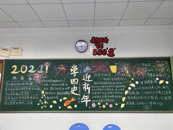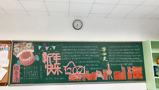 为营造浓厚的校园文化氛围,烘托迎接新年的节日气氛,我校举行了以“迎新年、学四史”为主题的黑板报评比活动。各班级在图案构思、色彩搭配与内容创意上,紧紧围绕主题,将同学们对于新年的喜悦尽情地表露,通过图画和文字相结合的方式诠释了各自对元旦和四史的理解、对过去一年的点结,对新的一年进行美好展望。