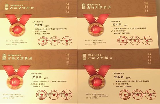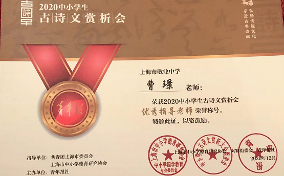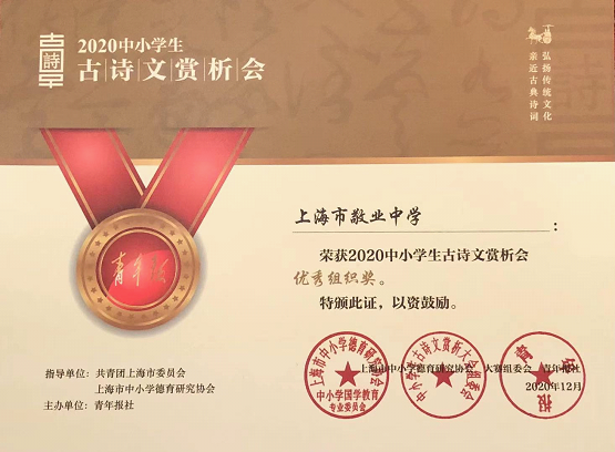 上海市敬业中学荣获2020中小学古诗文赏析会优秀组织奖