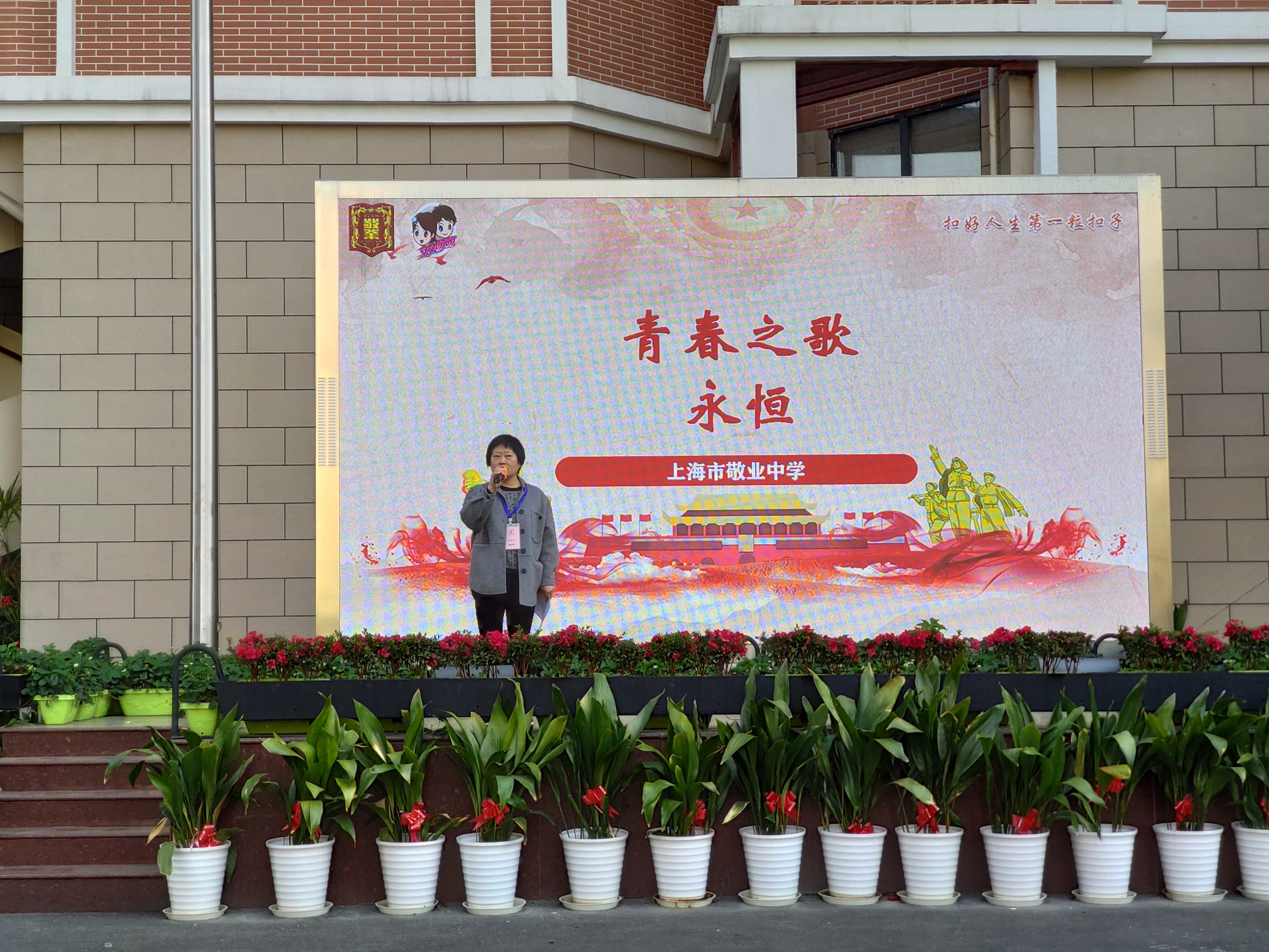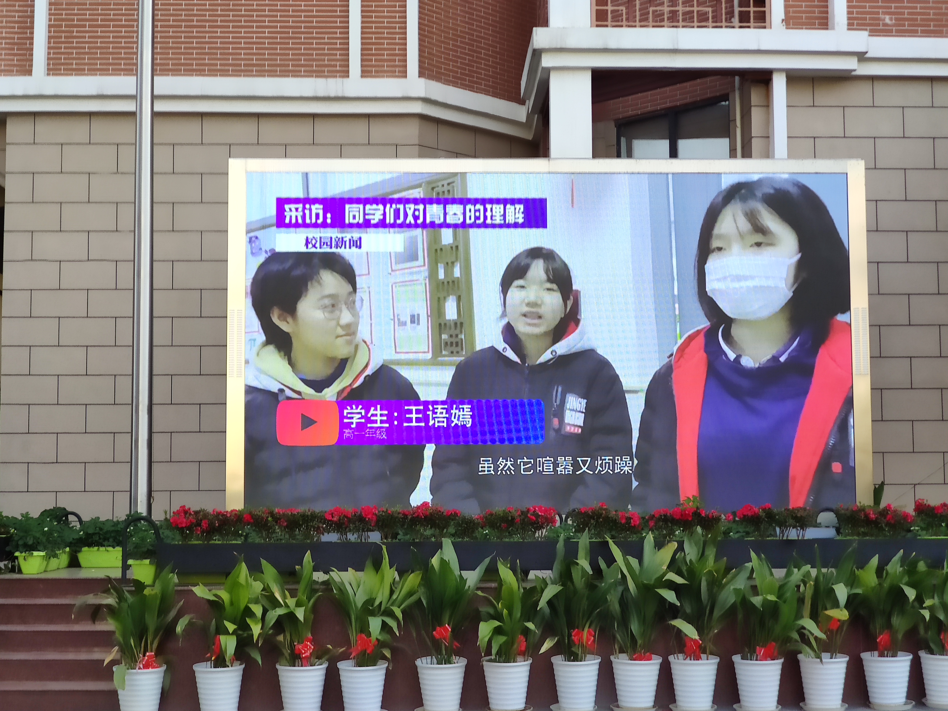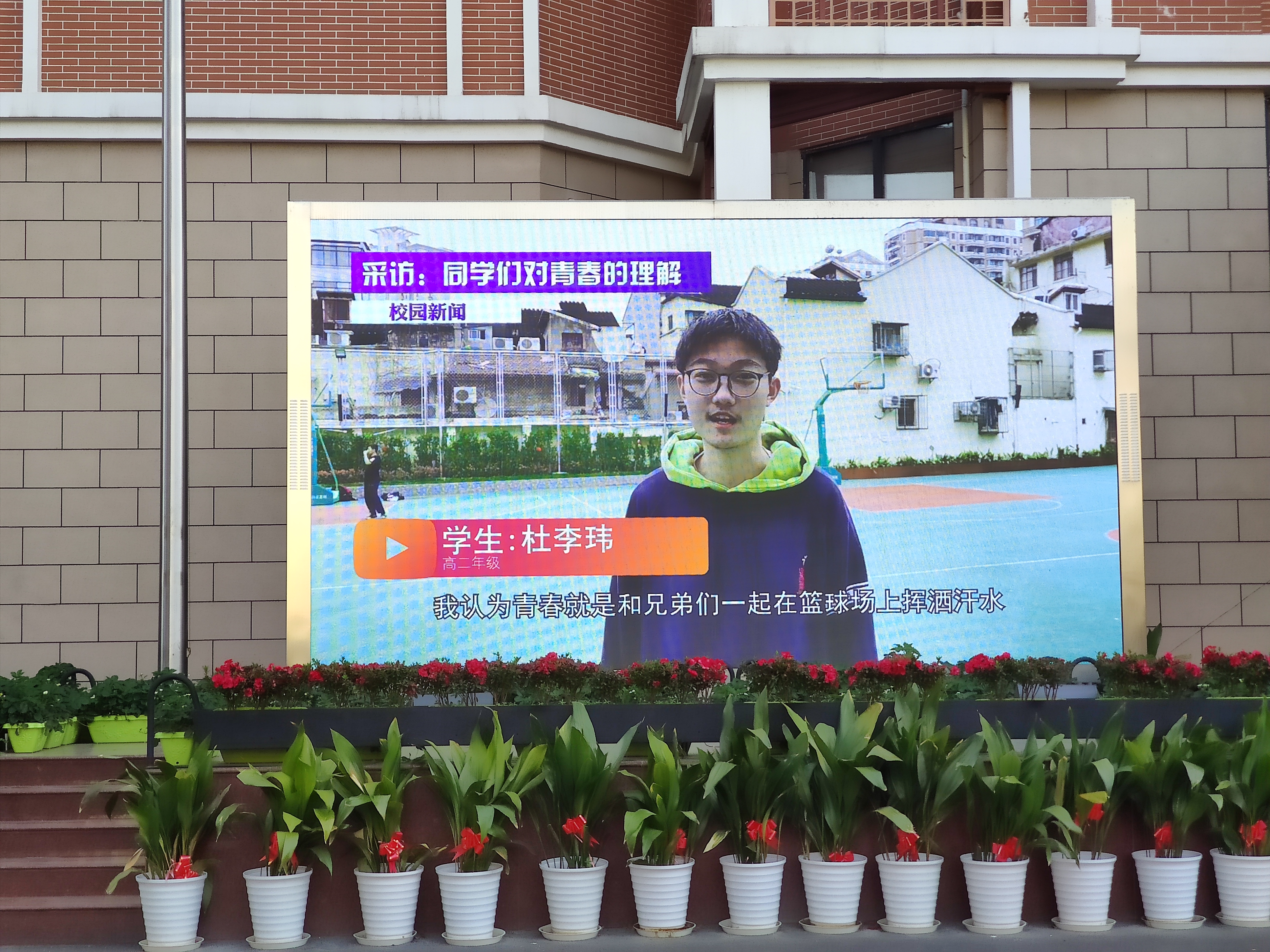 然后,吕老师播放了学生版《青春是什么样?》和教师版《青年教师风采》vcr,让同学们了解到了谆谆学子对青春的理解,学习到了青年教师们身上精雕细琢、精益求精的精神。之后,八位高二年级班主任教师齐聚台上为全校同学寄语,让同学们认识到应始终保持艰苦奋斗的前进姿态,在新长征路上奋勇搏击的真正内涵。吕老师最后用习近平总书记的语录“青春由磨砺而出彩,人生因奋斗而升华”进行了总结。