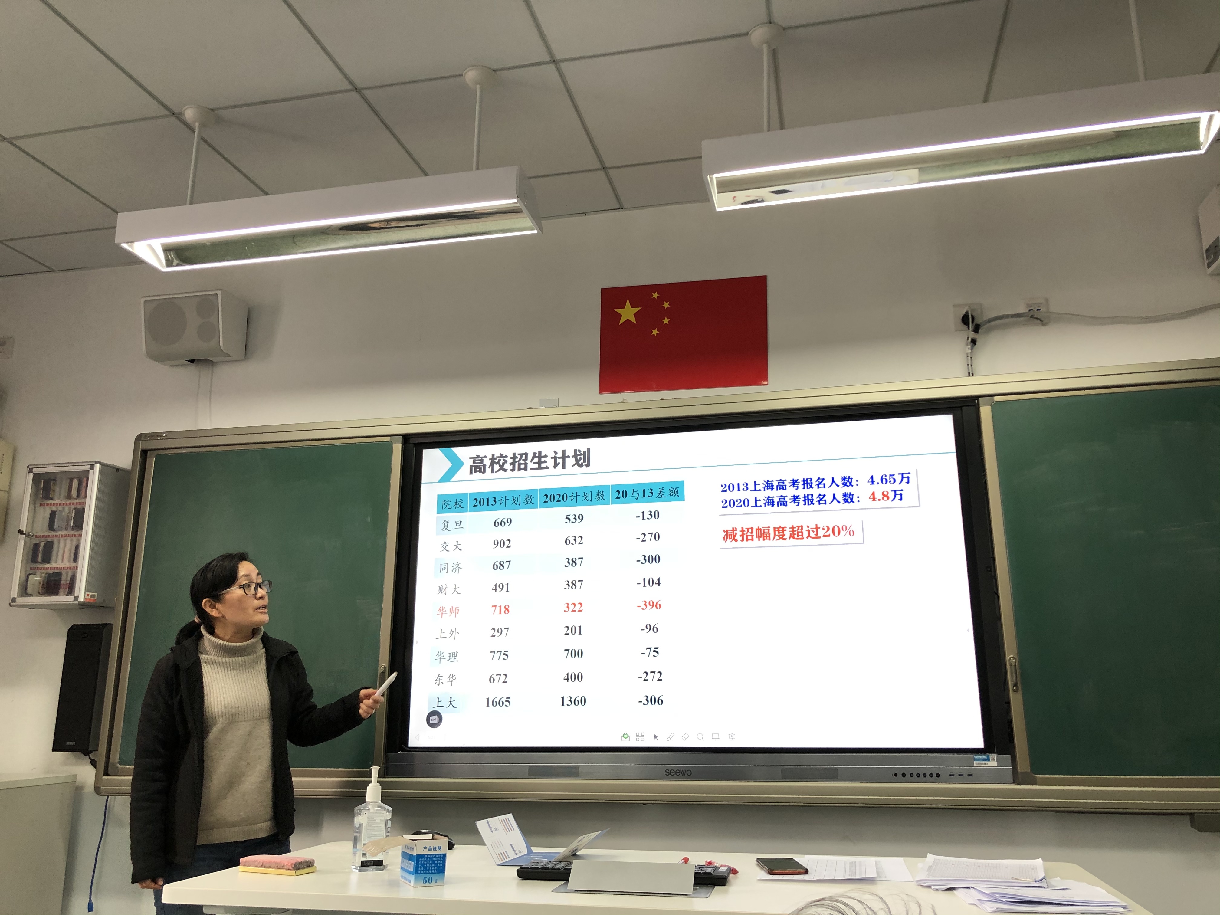 卫老师先向同学们解释了高考“3 3”政策,提出在如今高校招生名额不断减少的趋势下,小三门选择的重要性。并且以敬业中学2020级毕业生作为例子,根据一模情况以及定位表,提供给了同学们一个充分的自我定位标准,再根据2018届高考成绩,将高二完成生物和地理两门学科等级考的学生以及高三选择完成剩余两门学科的同学的语数英成绩作比较,对比得出,前者比后者平均高出13分,最后列举几位历届和本届的学生的成绩和其选择的小三门科目,结合学校九游会国际官网的霍兰德测试等进行具体评析,因此得出了推荐同学在高二完成“双选”的建议。