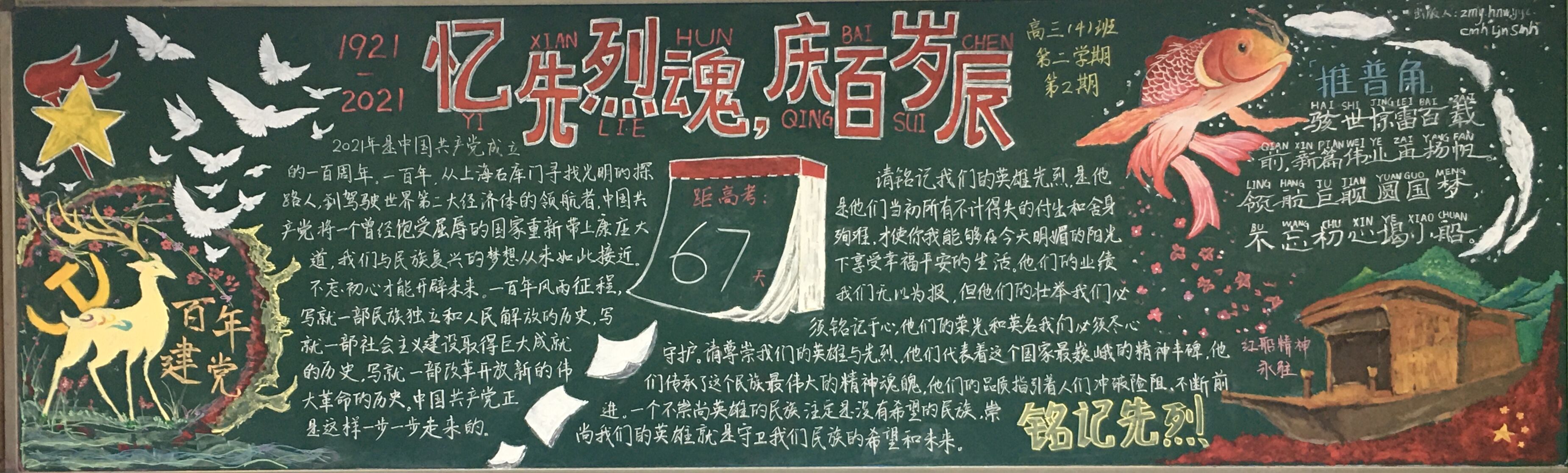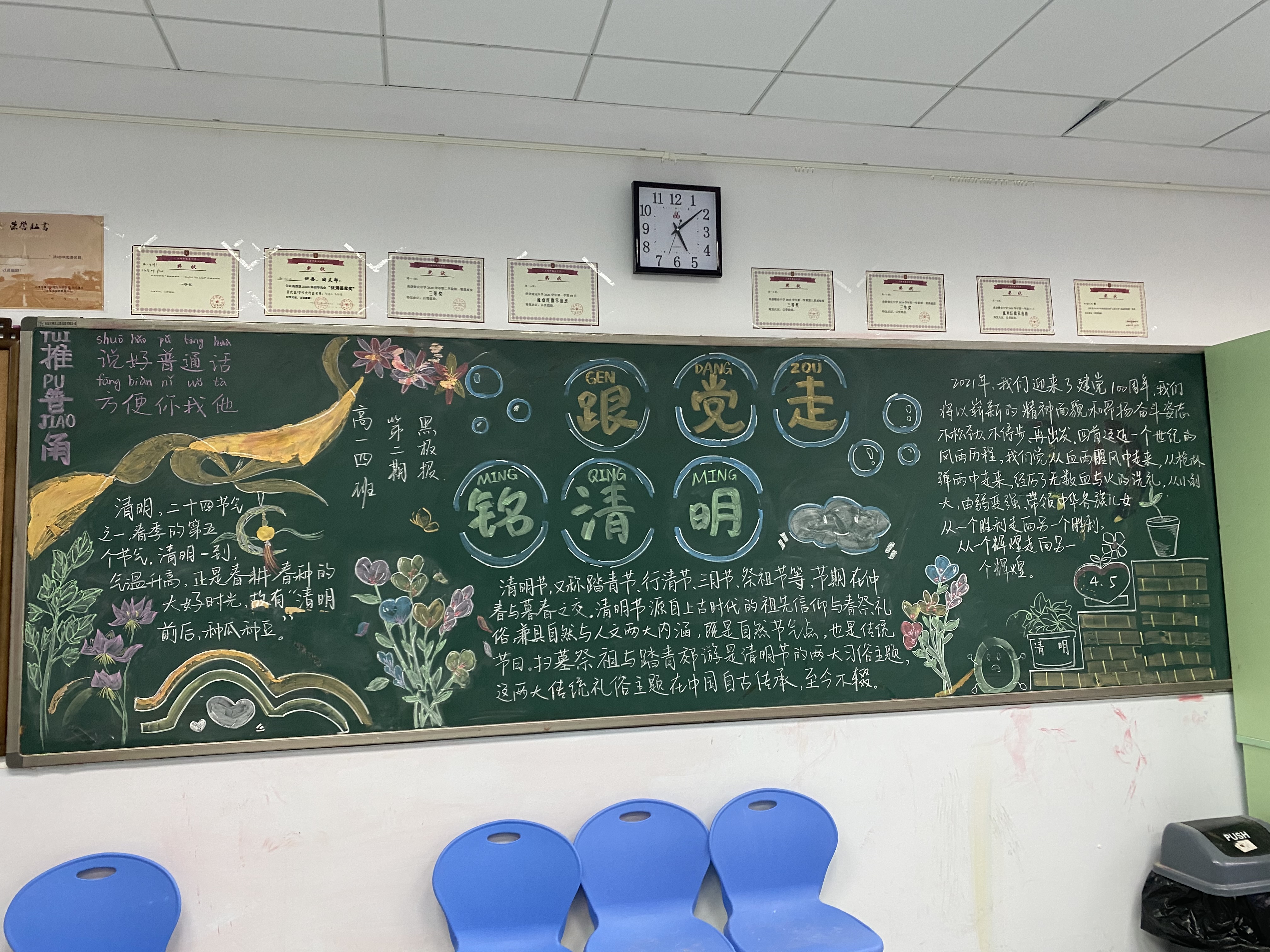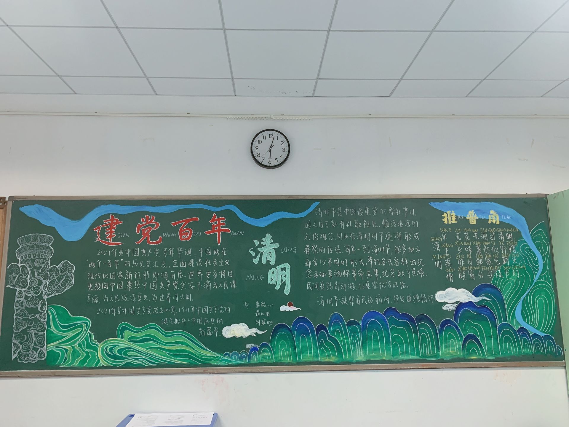 燕子来时新社,梨花落后清明。清明是二十四节气之一,也是我们缅怀先烈,祭奠逝者,追思故人的传统节日。为传承中国传统节日习俗,缅怀和悼念为革命牺牲的烈士,弘扬民族精神,发扬先烈遗志,积极向革命先烈学习,2021年4月,上海市敬业中学开展了以“迎建党百年,清明祭英烈”为主题的黑板报评比活动。