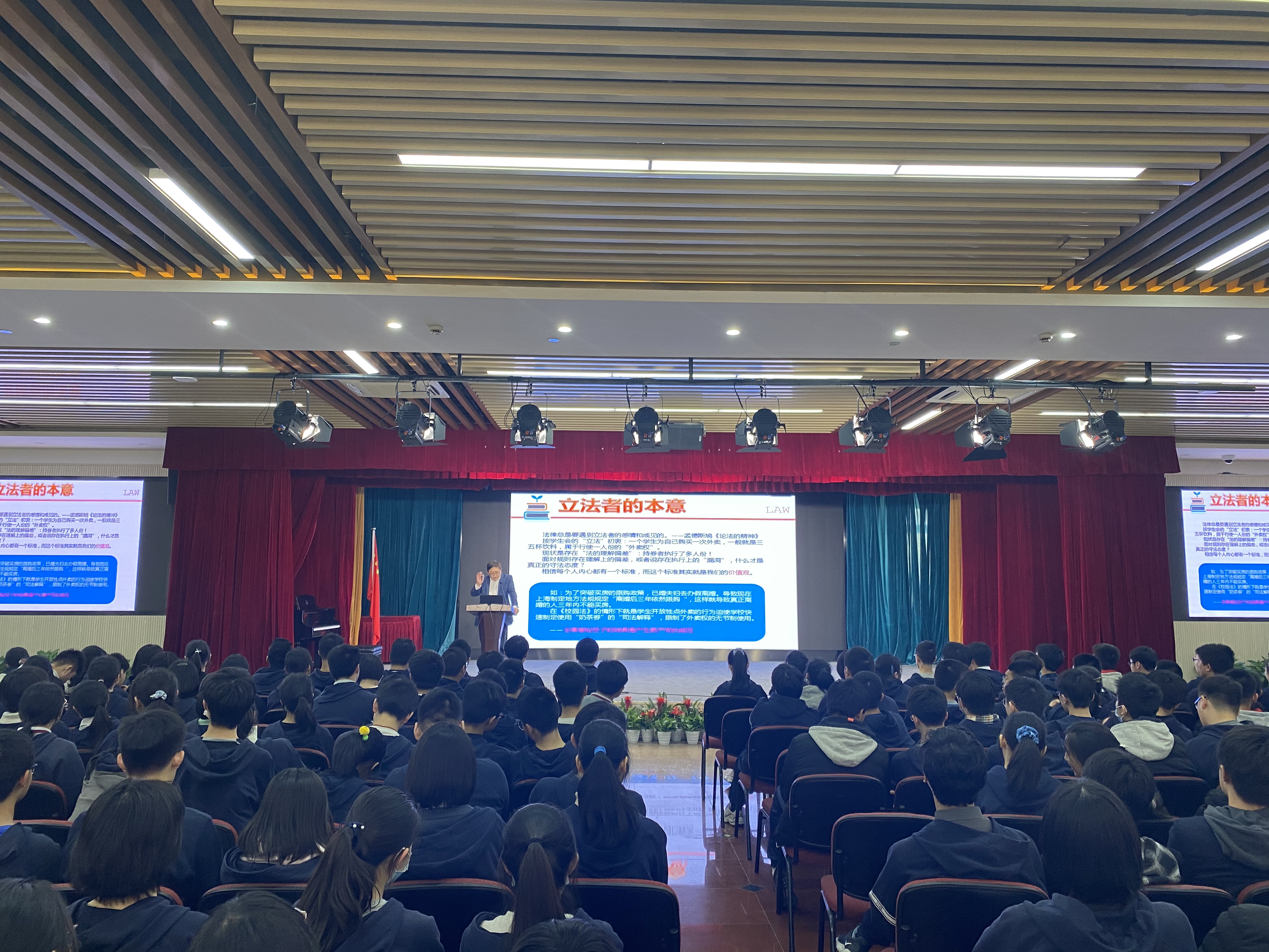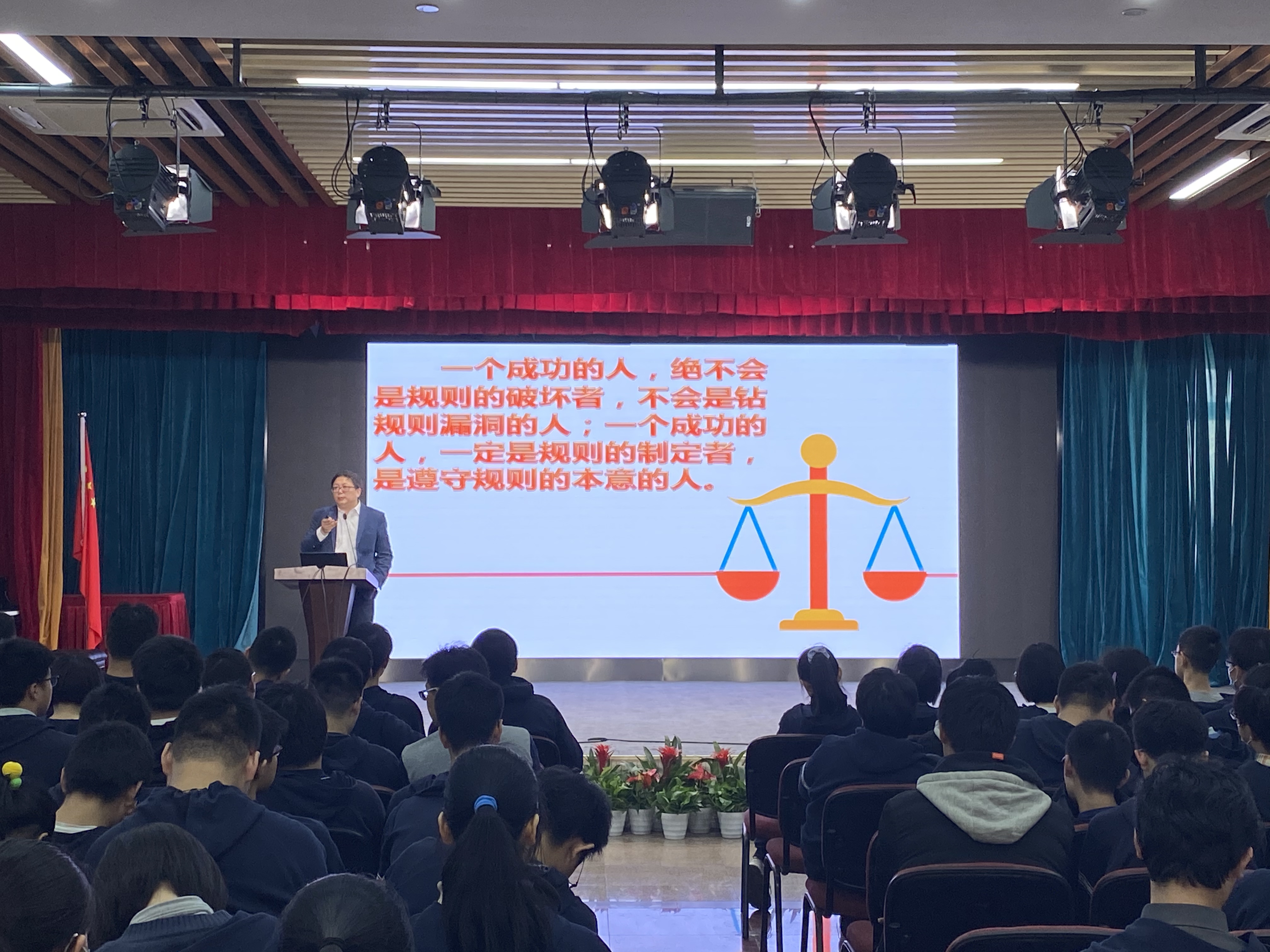 正如讲座最后钟思慧老师提到的:一个成功的人,绝不会是规则的破坏者,不会是钻规则漏洞的人;一个成功的人,一定是规则的制定者,是遵守规则本意的人。从而为这一次的年级大会,添上了画龙点睛的一笔,加深了同学们内心中对于秩序规则的认同感。
