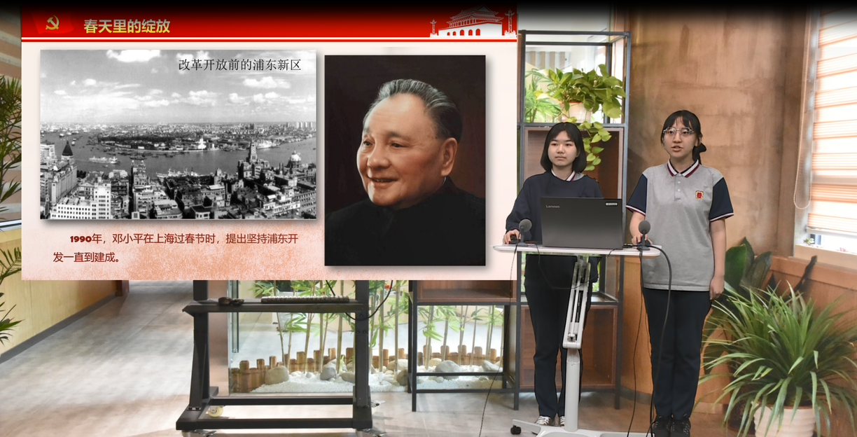 “在春天的故事里成长”主要由三个板块组成,分别是:春天里的起航,春天里的绽放、春天里的期望。同学们聚焦家庭、学校、上海乃至整个国家的改革开放成就,结合实际案例,将改革开放的故事娓娓道来。第一篇“春天的起航”,傅思瑶同学从安徽凤阳小岗村18位农民立下生死状的故事讲起,带领大家回顾了改革开放的历程。第二篇“春天里的绽放”,悦可欣、王语嫣两位同学从一张船票,细看数十年上海浦东改革开放;陈绮雯同学采访了金怡校长,工会主席王旭峰老师以及德育教导袁凌蓉老师,请他们介绍了敬业中学在改革开放大背景下进行的教改举措及取得的一系列成就;夏浦轩同学通过一位会说九国语言并且十分向往中国的柬埔寨男孩沙利的故事,让大家看到了中国“一带一路”倡议对周边国家的影响。第三篇“春天里的期望”,在刘怡鹏同学讲述了“万里的故事”之后,黄浒老师从中国共产党始终以人民为中心,始终走在时代前列两方面进行分析,指出中国共产党的领导是我国改革开放取得成功的重要保证。通过本次主题校会,同学们对我国伟大的改革开放有了进一步的了解,更加坚定了跟党走的信念。敬业学子们纷纷表示要认真学习,积蓄力量,努力成为续写我国春天故事的主角!