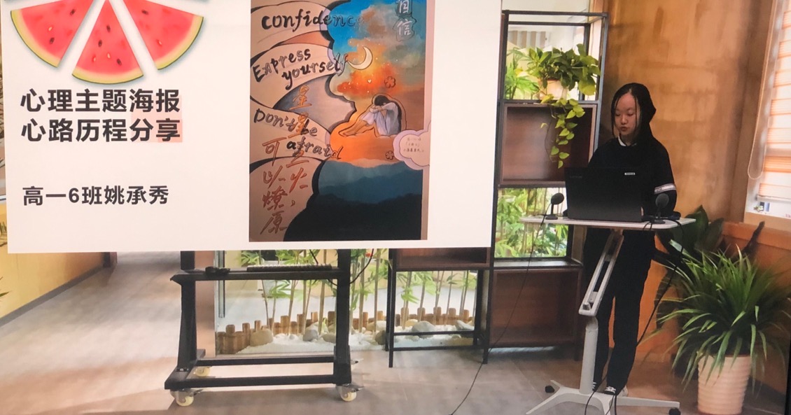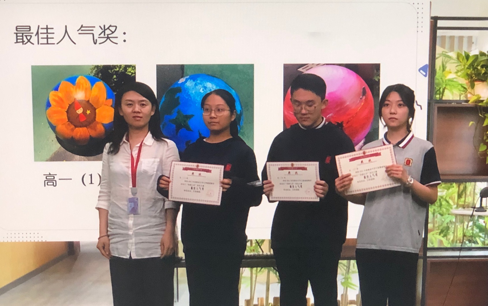 在“描绘心灵的春天”板块,高一年级通过手绘或是板绘的方式,进行了心理海报的创作。各位高手妙笔生花,一幅幅动人、充满创意的的画作跃然纸上,为同学们带来一番视觉上的盛宴。一等奖获得者姚承秀同学分享了她的创作心路历程。学校还开展了“美丽心灵”校园美化大赛。高一、高二年级各班在大赛中,为校园的圆球穿上一席美衣,成为了一道靓丽的风景线。心理教师姚项哲惠、德育教导袁凌蓉分别为海报获奖学生和“美丽心灵”大赛人气奖颁奖。
