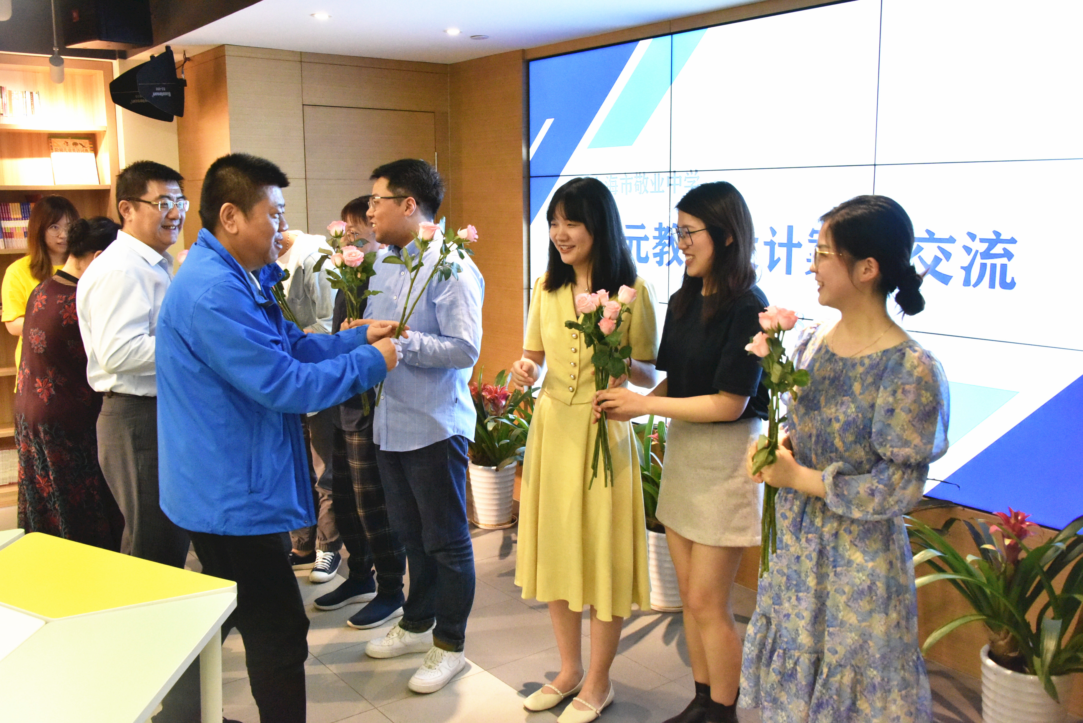 展示完毕后,现场教师纷纷将手中的鲜花献给主讲的青年教师们,为他们的出色表现点赞。活动最后,金怡校长和张丽霞校长围绕“单元”“设计”和“案例”三个核心点,从“目标、过程和评价”三个维度,分别总结和点评了文科组、理科组的设计案例。
