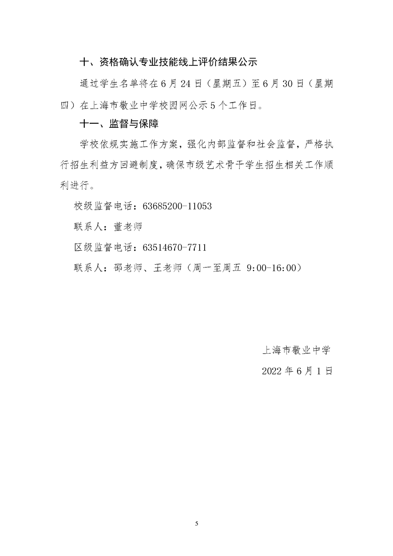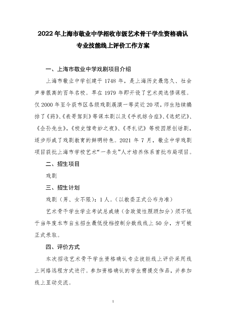 2022年上海市敬业中学招收市级艺术骨干学生资格确认专业技能线上评价工作方案