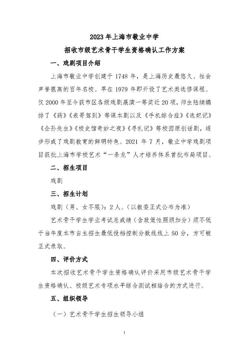 2023年上海市敬业中学 招收市级艺术骨干学生资格确认工作方案