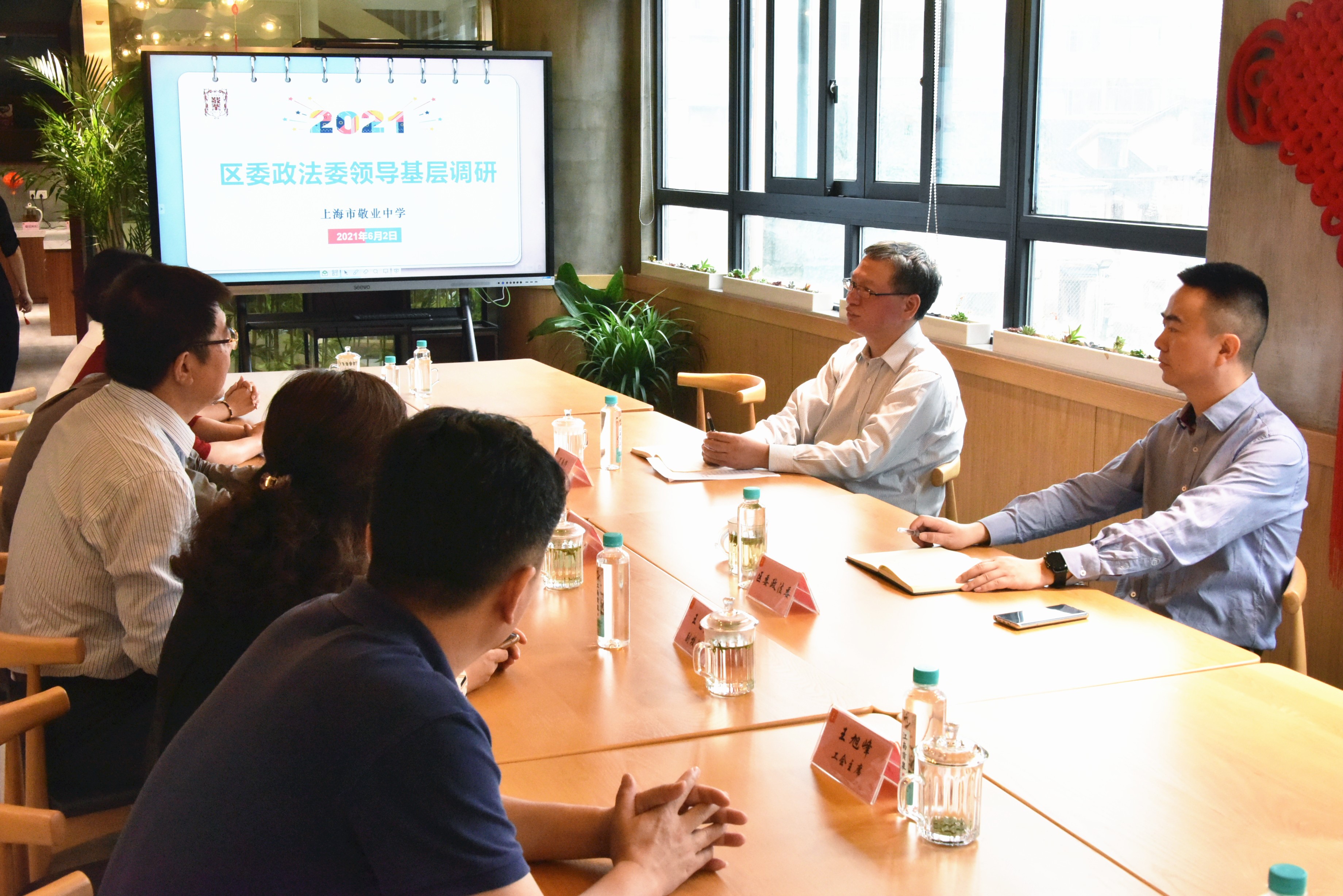 6月2日,黄浦区委常委、政法委书记吕南停来到敬业中学调研学校工作。区委政法委副书记王斌、区教育党工委书记陈亮共同陪同。