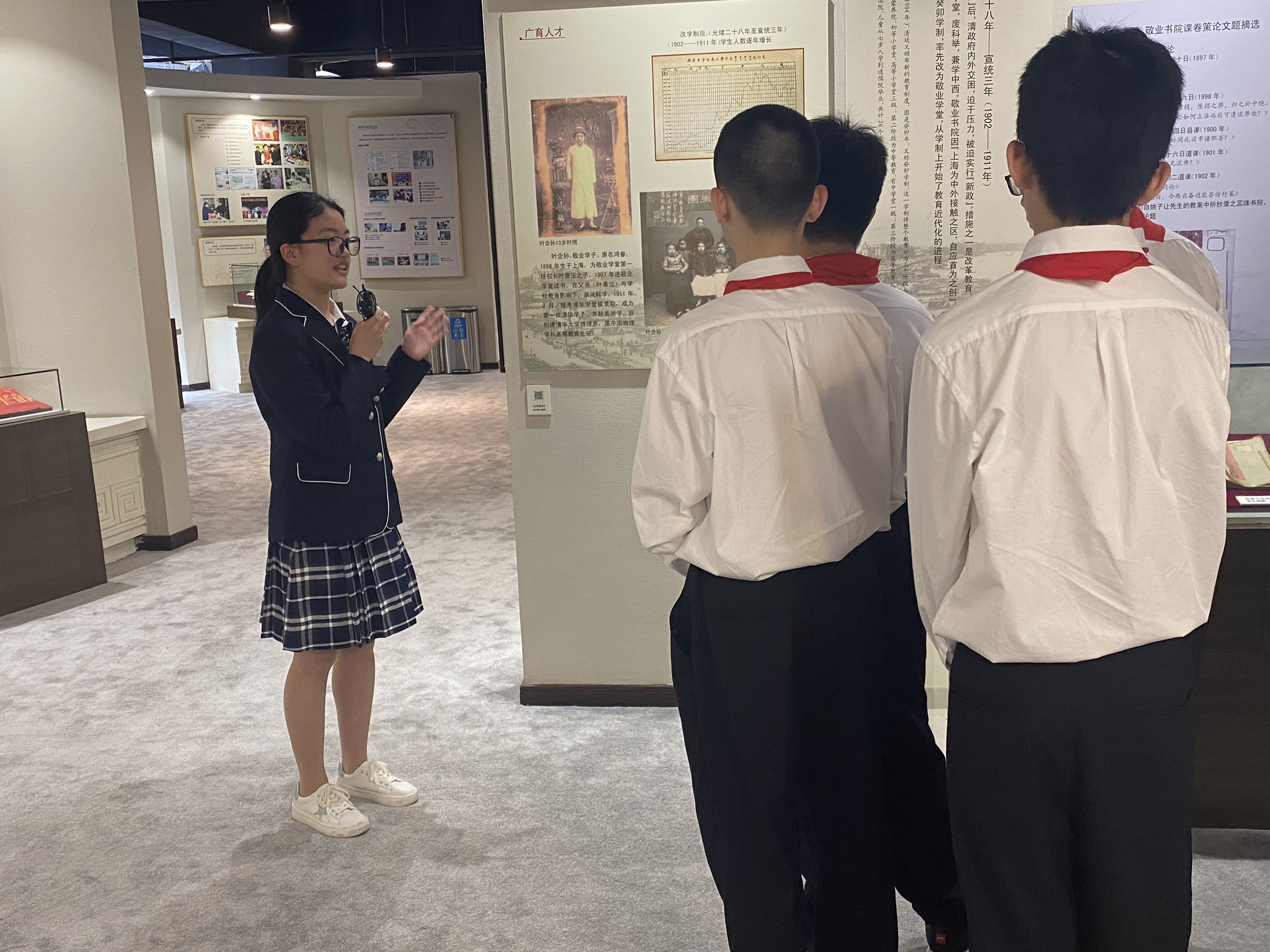 本次校史馆的讲解由我校高一学子担任,他们是毕业于金陵中学的黄嘉敏、凌睿嘉、孙嘉怡以及毕业于市南中学的王喆璟、裴皓祎。为了确保讲解的顺利进行,他们前期多次利用课余时间前往校史馆深入学习,准备资料完成讲解培训。在本次活动中,各位讲解员热情洋溢,共同合作。从敬业中学的校训与起源,到抗日时期敬业先辈投身于爱国运动的拼搏精神,再到近代敬业中学革故鼎新,以学生发展为中心,建立生涯规划指导等方面进行介绍。金陵学子们目不转睛,听得津津有味,并积极与讲解员进行互动。