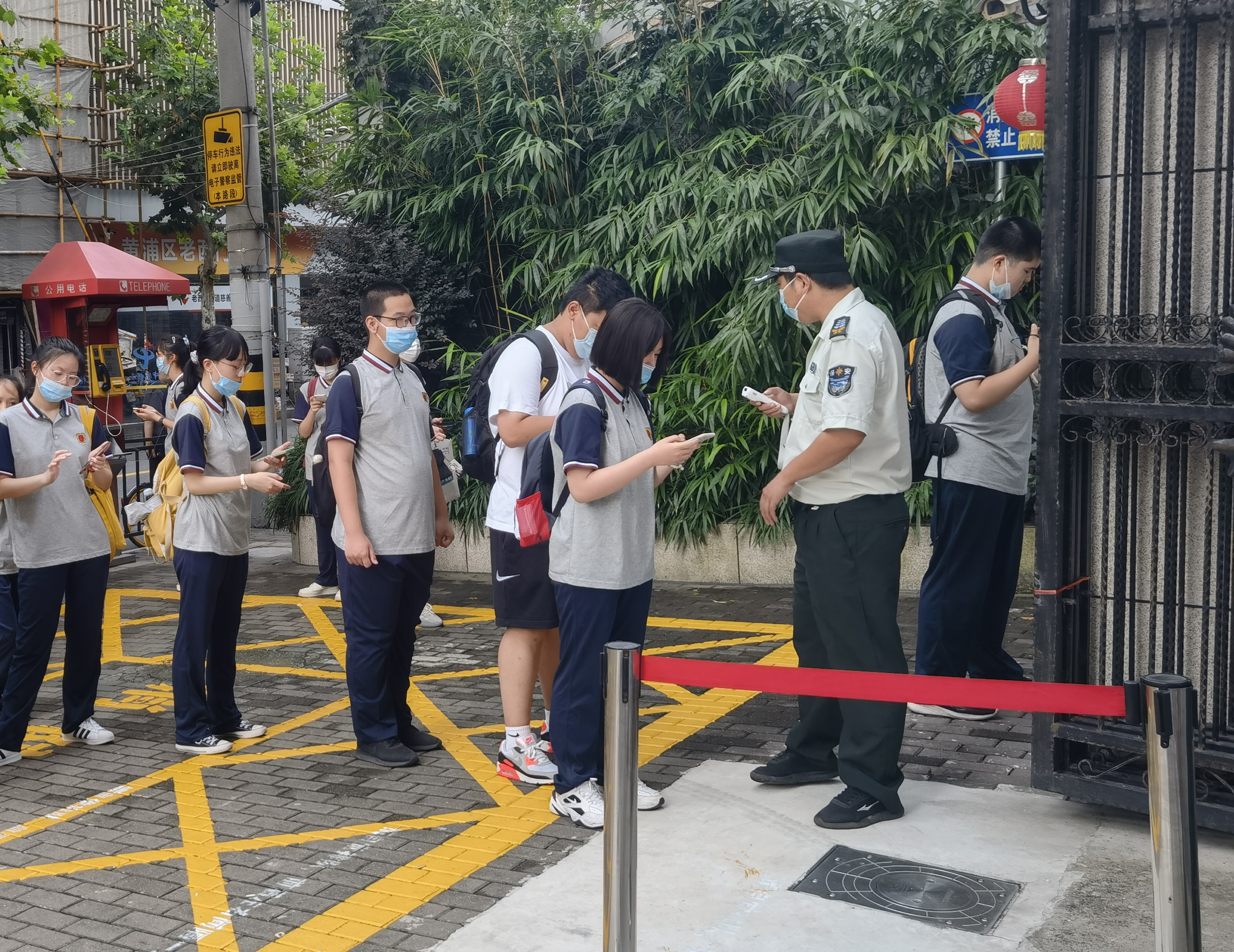 清晨,同学们身着崭新的校服、佩戴口罩、间隔一米,核验健康码与行程码、测量体温后进入校园,在用消毒液清洁双手后进入教学楼。
