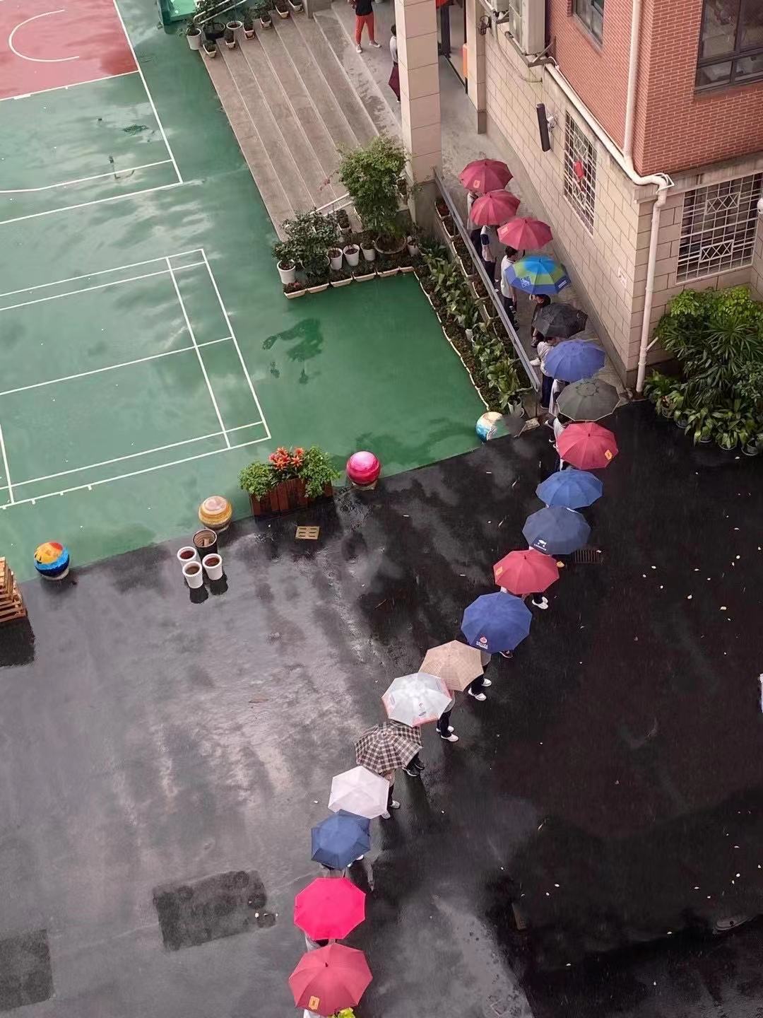 午后,终于迎来激动人心的班级队列展示环节。然而,风云突变,一阵大雨阻碍了同学们从乐群楼前往敬业楼汇合的脚步。突然一道温暖感人的风景线出现了,两栋楼之间短时间内形成一条“伞廊”,敬业学子的众志成城、协作互助使得后续活动准时进行。