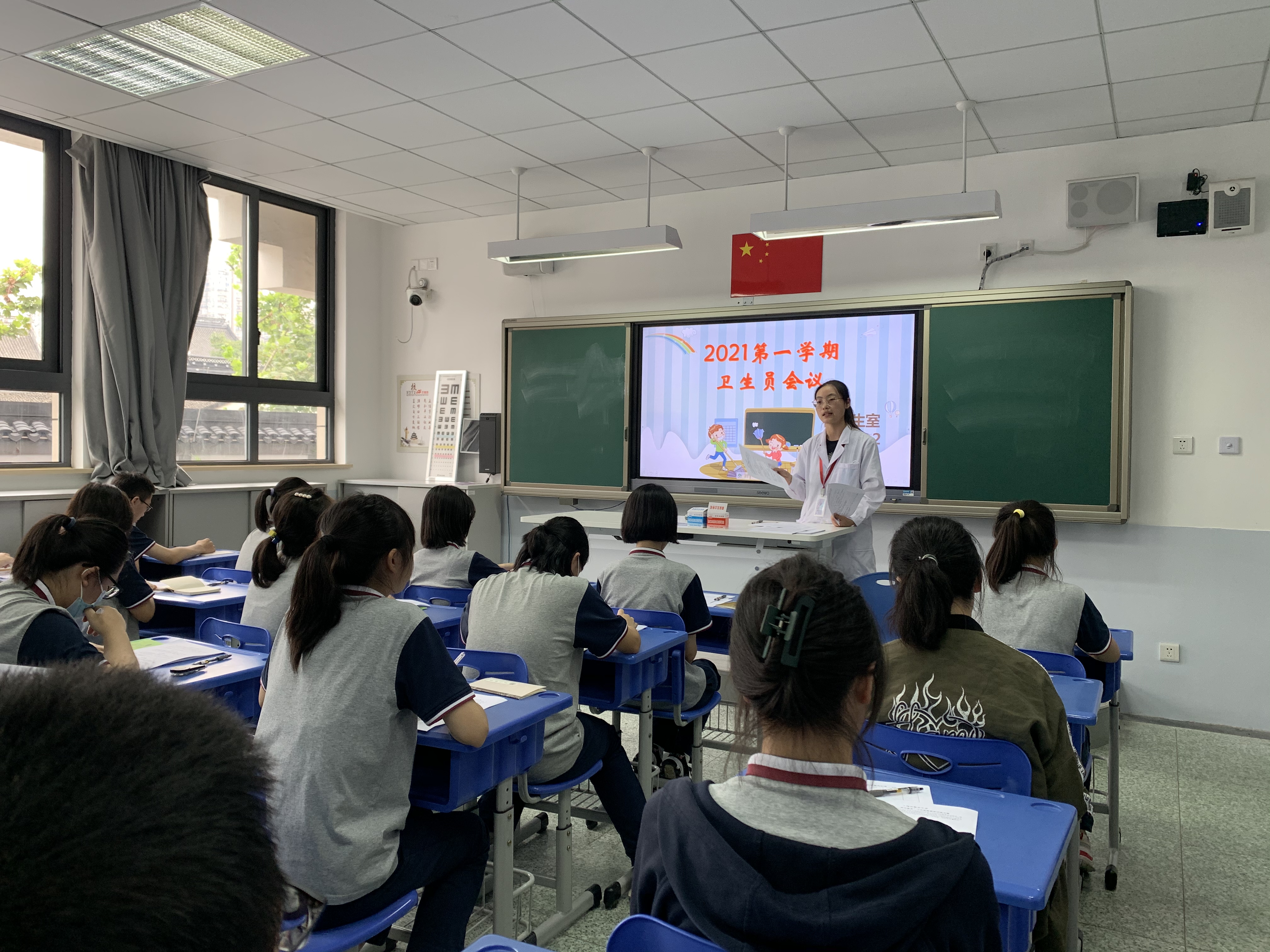 会议上,孟老师首先强调了卫生员的职责以及卫生员岗位的重要性。在防疫方面,卫生员就是每个班级的“守门员”、“监督员”。卫生员要做好各项防疫措施的表率,监督好同学做好自身防护,如饭前饭后的洗手、教室的开窗通风等,才能更好地帮助学校落实好各项防疫措施,保护好自己和同学们的健康。在卫生方面,为卫生员详细解读了教室环境卫生要求细则、垃圾分类要求。落实好每一项卫生工作要求,才能营造一个干净整洁的学习环境。其次,讲解了卫生星级教室的评选方案,希望各卫生员积极动员班级同学争创星级教室,努力营造一个健康整洁的学习环境。