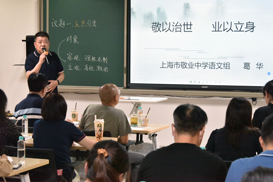 在此次教研活动中,我校语文组教研组长葛华老师向在场教师们介绍了敬业中学语文教研组团队。葛老师从教师成长、主题教研、特色作业、学生活动四方面展示了我校语文组在“双新”背景下开展的教研教学活动。葛老师指出,课程与教学的改革离不开每一位教师的努力。教师们面对新机遇、新挑战,需借助良好的土壤与平台,积极探索,精研思考,继续争优创先。