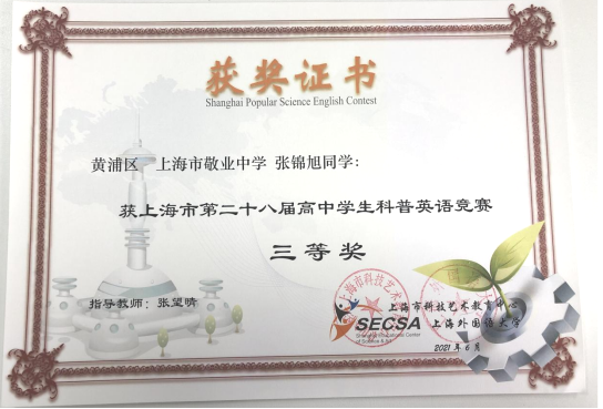 我校张锦旭同学获上海市高中学生科普英语竞赛三等奖