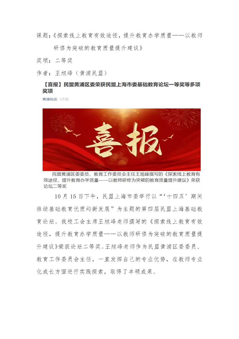 我校教师王旭峰在第四届民盟上海市委基础教育论坛获奖