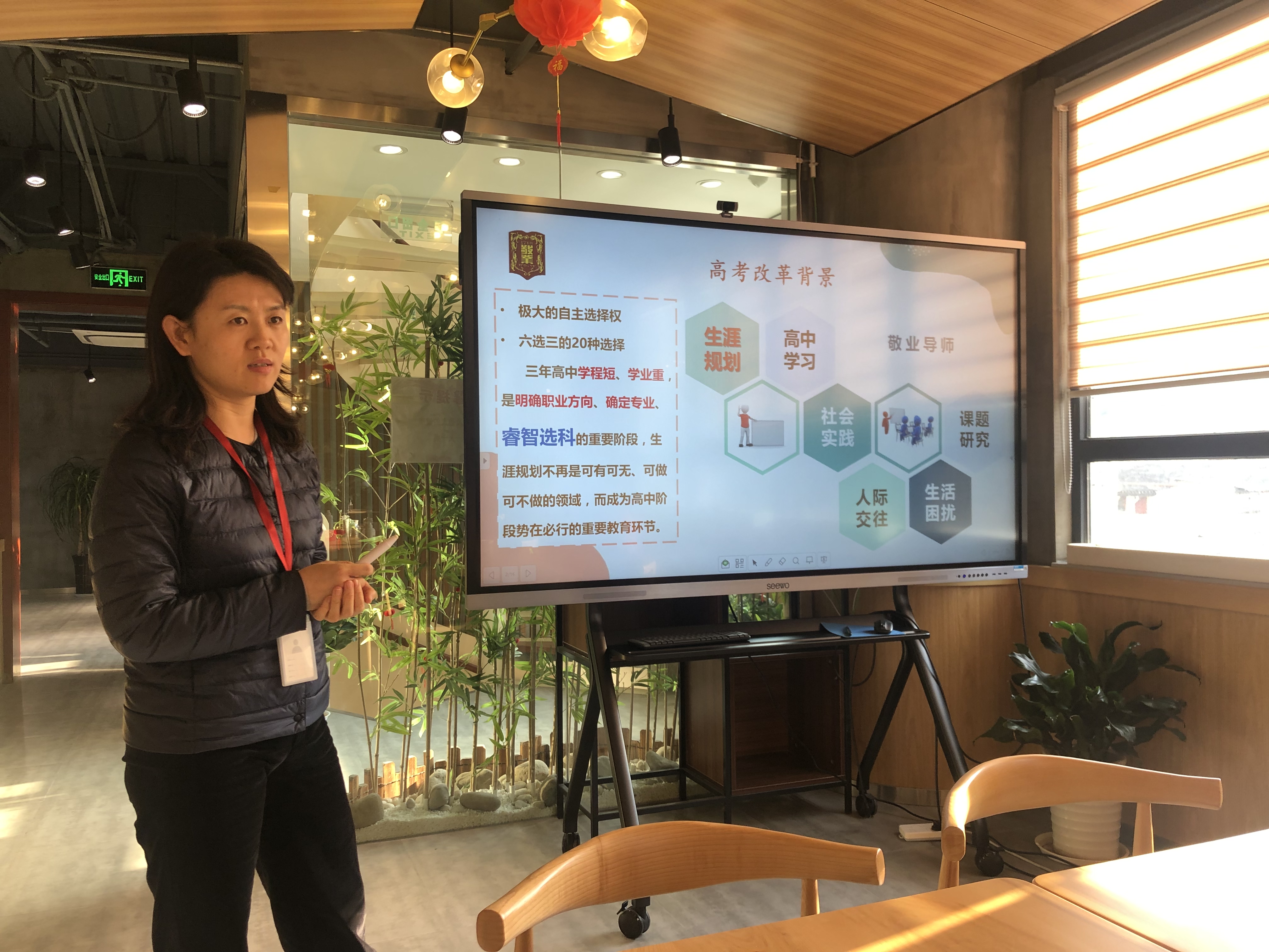 参观结束后,敬业中学科创班班主任王骁尧老师为学员们介绍了敬业的德育特色活动——红色行走系列活动。该活动以旅游线路设计的方式,充分调动了学生的积极性,发挥创意,锻炼了各方面的能力。德育教导袁凌蓉老师介绍了敬业中学在生涯规划指导方面的特色工作,学校专项开发“上海市敬业中学学生生涯规划系统”,功能涵盖了“在线测评、在线选意向专业、在线听课、在线选科、线下讲座、社会实践、课题研究、课外阅读、志愿填报、政策答疑”等一系列生涯规划活动,班主任借助生涯规划系统,逐步引导学生树立正确的世界观、人生观、价值观。尤其是学校的“创客梦想”活动,不仅为学优生提供了更广阔的学习空间,更为其发展兴趣,培养特长,职业规划等提供了平台,助力成长。
