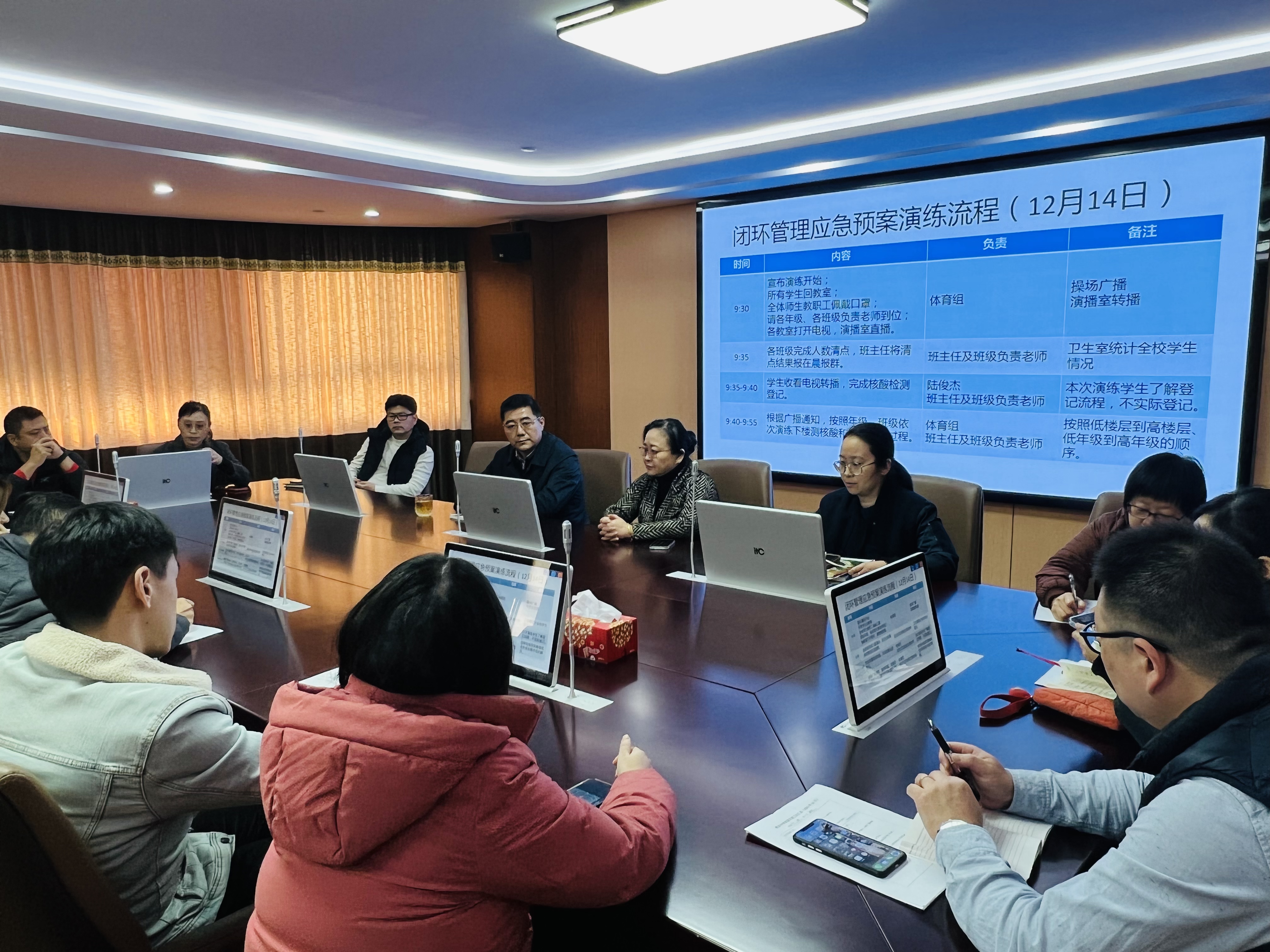 12月10日,我校召开应对疫情闭环管理应急预案演练准备会议,本次会议由德育主任钟思慧主持,校长金怡、书记马伟和工会主席王旭峰与会指导,校办主任周征红、总务主任计徐康与年级组长吕根红、崔嵘、陈慧老师及年级组长助理吴晓彦、翁则人老师,卫生老师王小雪参加会议。