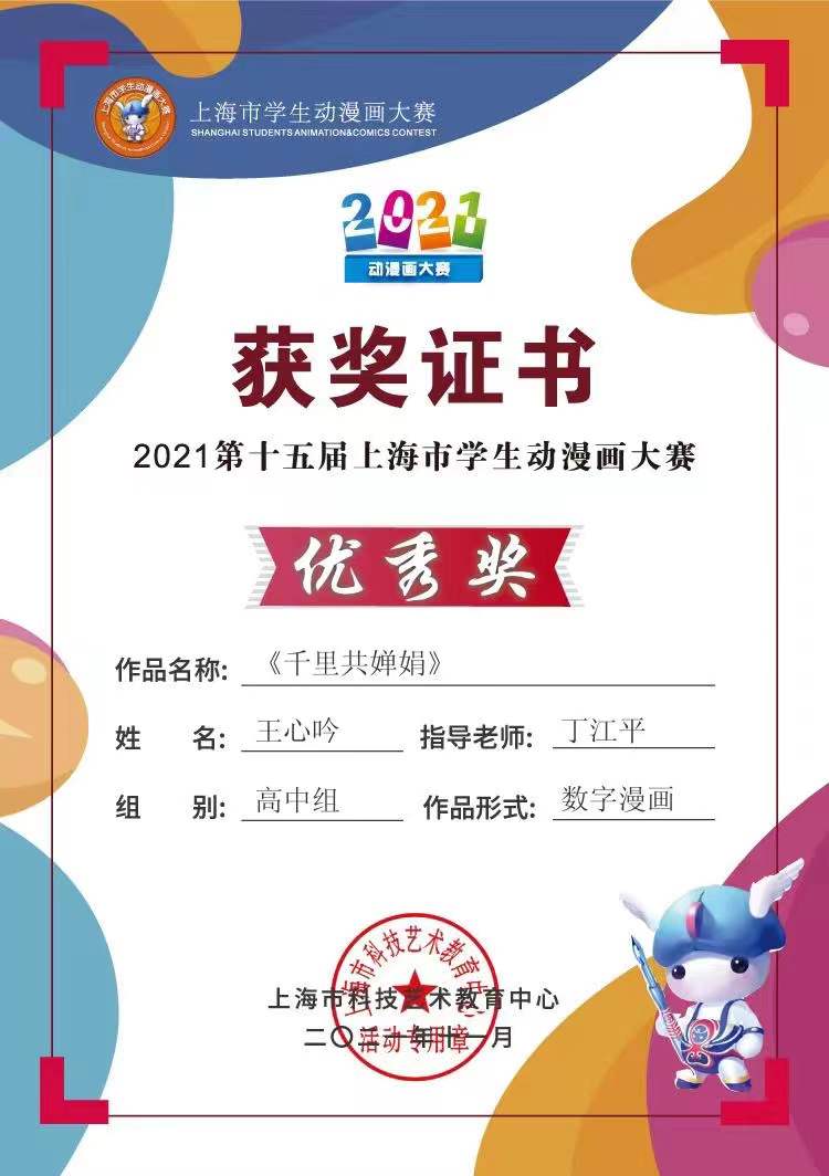 2021年10月,敬业学子动漫画作品在第十五届上海市学生动漫画大赛获奖。