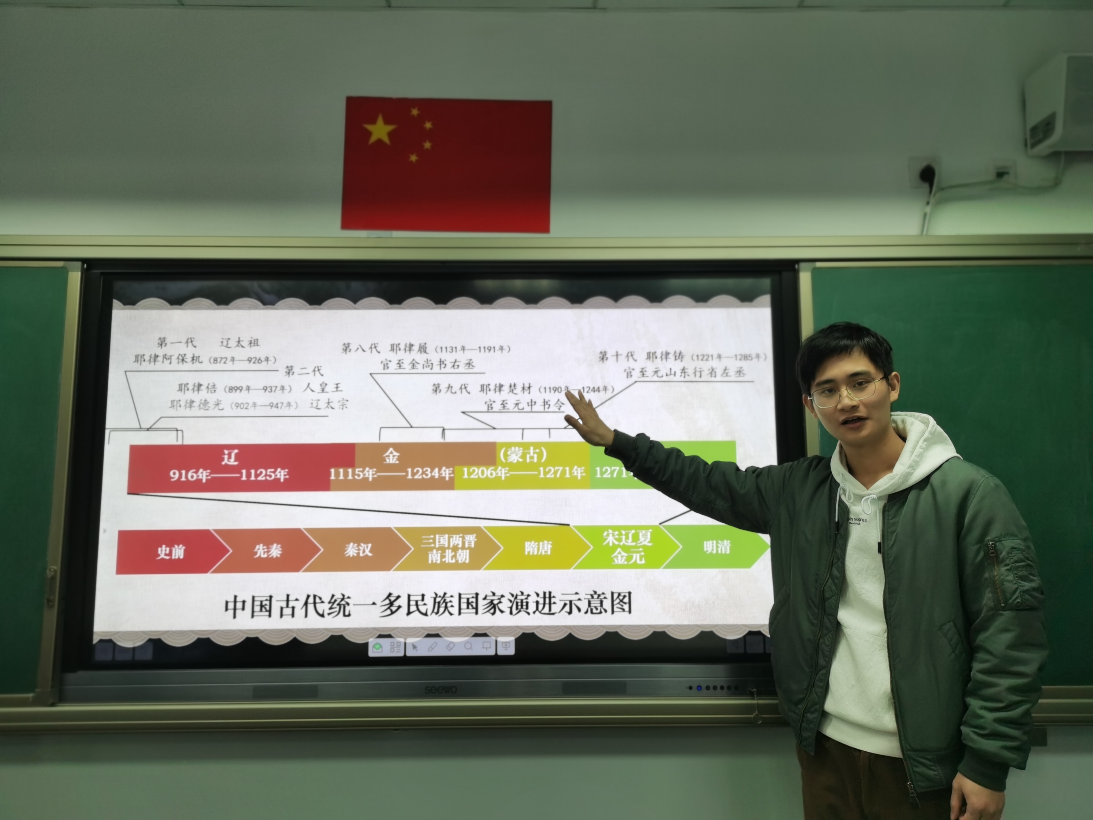 最后,邵家豪老师对市中青年教师教学评比一等奖获奖课《辽夏金元的统治》进行了说课。邵老师在对“双新”理念学习和教材文本研读分析的基础上,对《中外历史纲要(上)》第三单元进行了整体设计。采用“叙史见人”的教学策略,通过耶律家族创设情境,贯通历史时空,展现辽夏金元时期的民族交融与大一统中央集权体制的发展,渗透落实“时空观念”、“历史解释”等核心素养,实践深度学习的新理念。