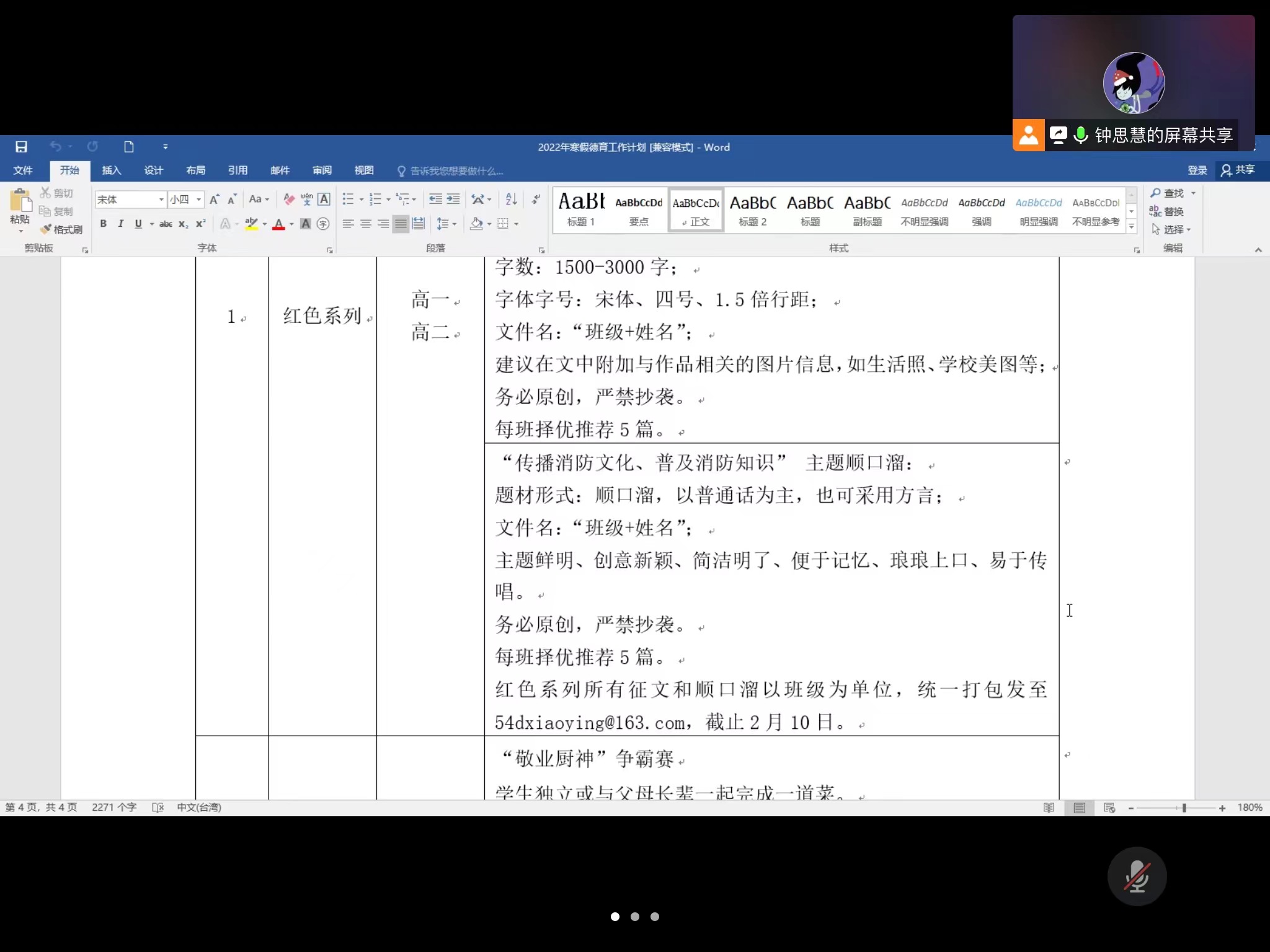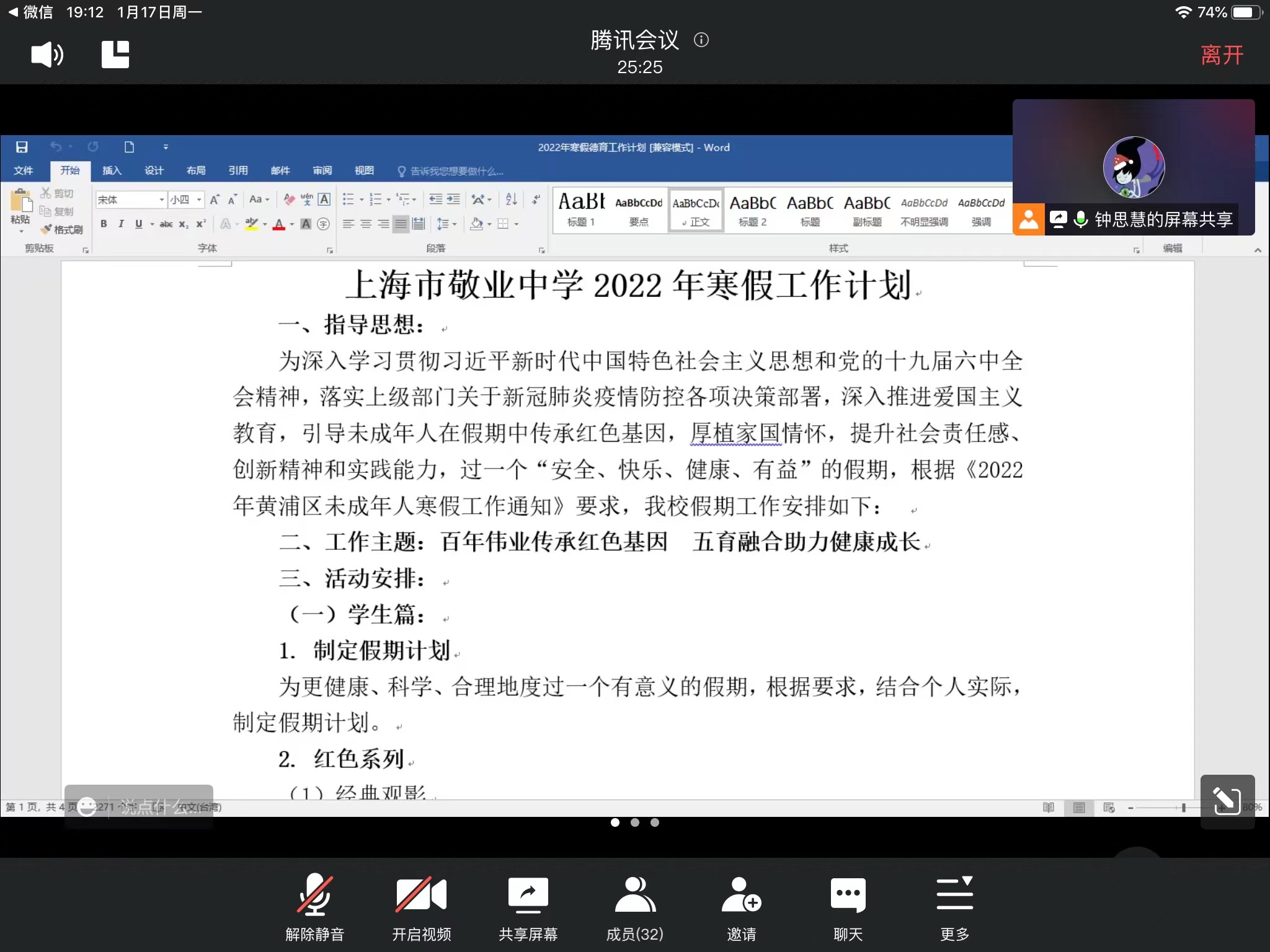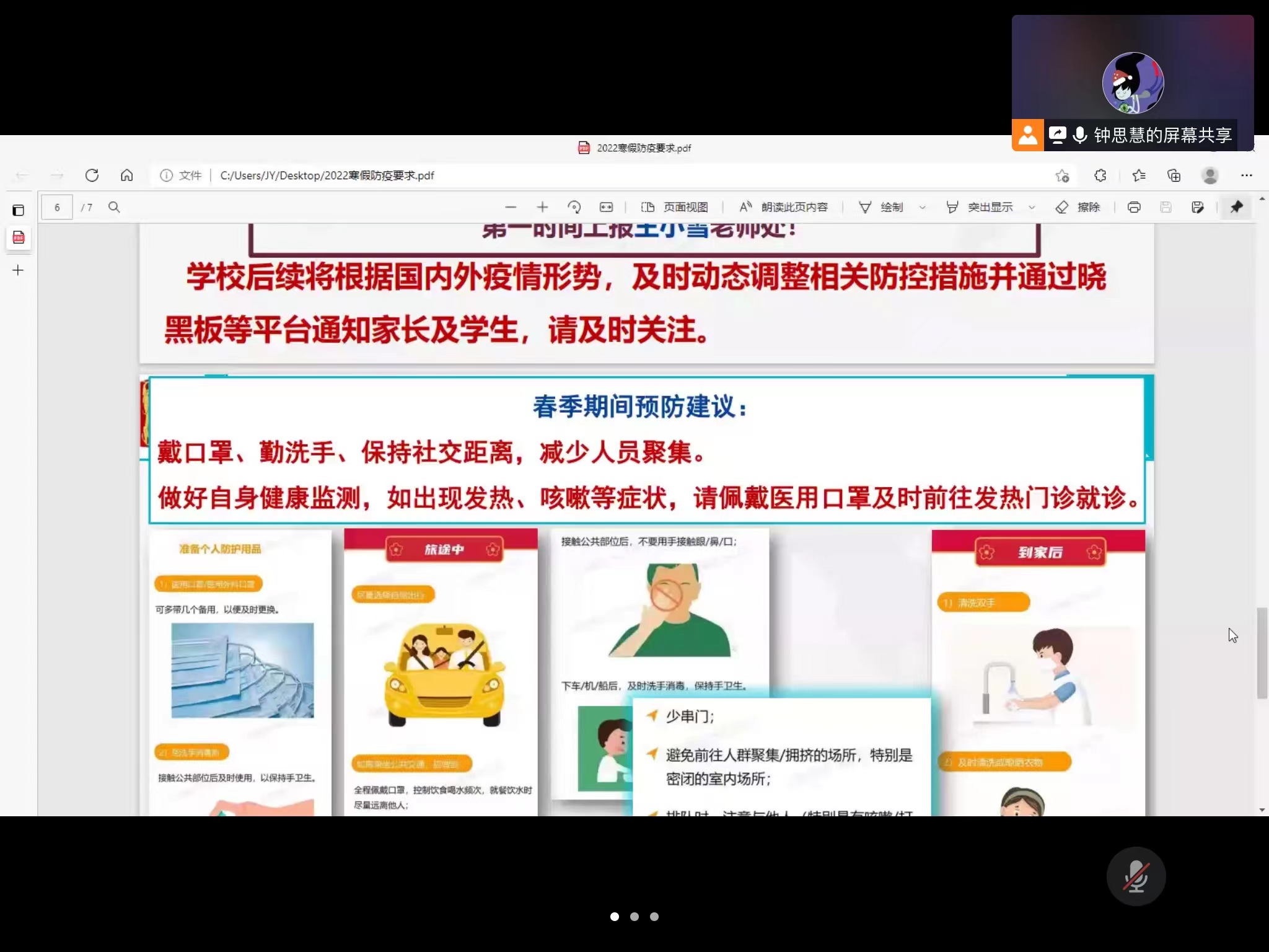 首先,钟老师介绍了期末和开学初日程安排等内容。随后,钟老师围绕学校“2022年寒假工作计划”详细介绍学生寒假活动,如“红色观影”“敬业厨神”等“红色、劳动、健康”系列主题活动。同时,结合心理健康教育和家庭教育指导,对班主任假期开展有效家校沟通提出建议。其次,讲解了本次寒假学校关于新冠疫情的具体防疫要求,并强调“非必要不出境、非必要不离沪,提前报、不瞒报”等学生管理细则。
