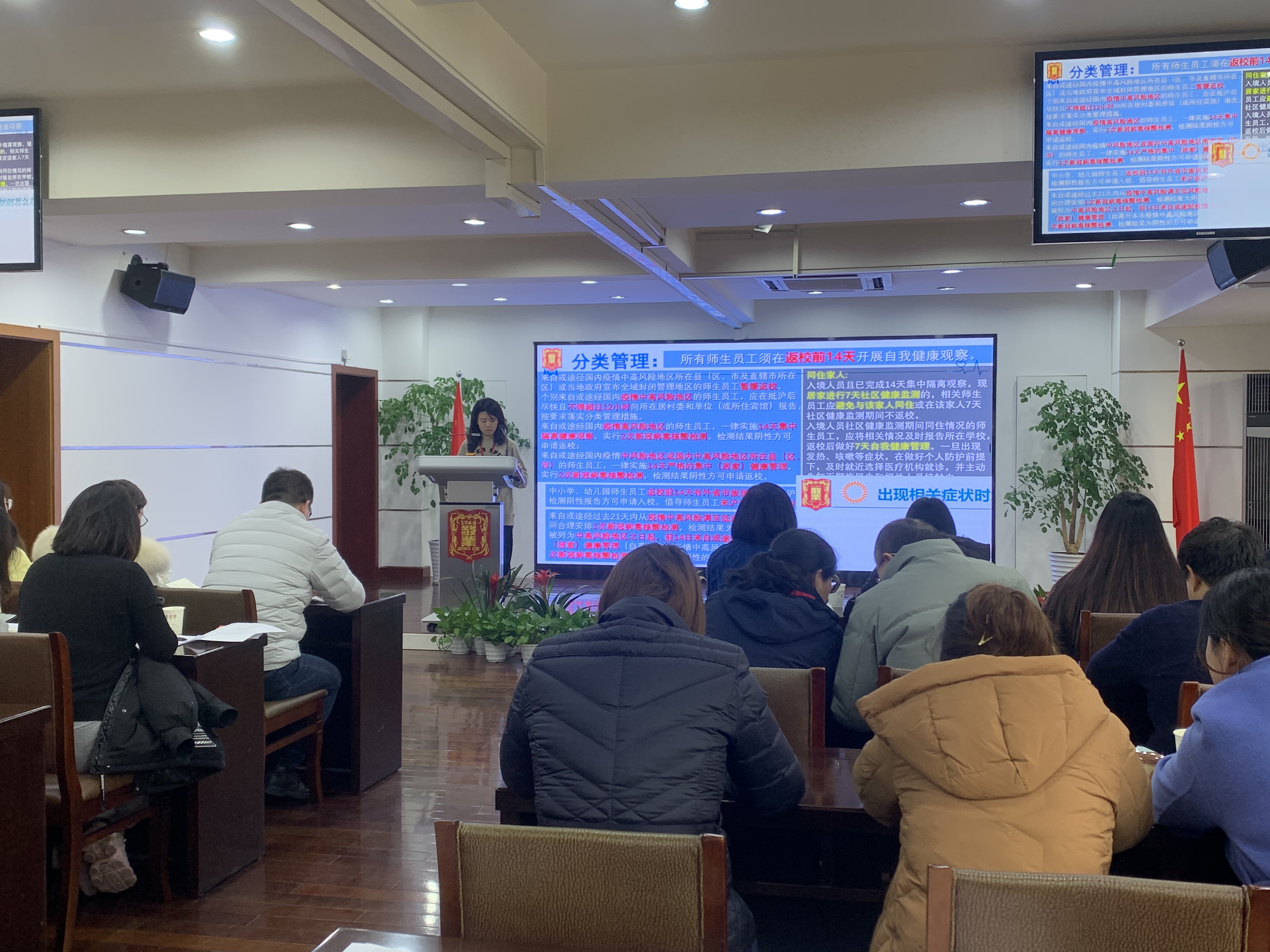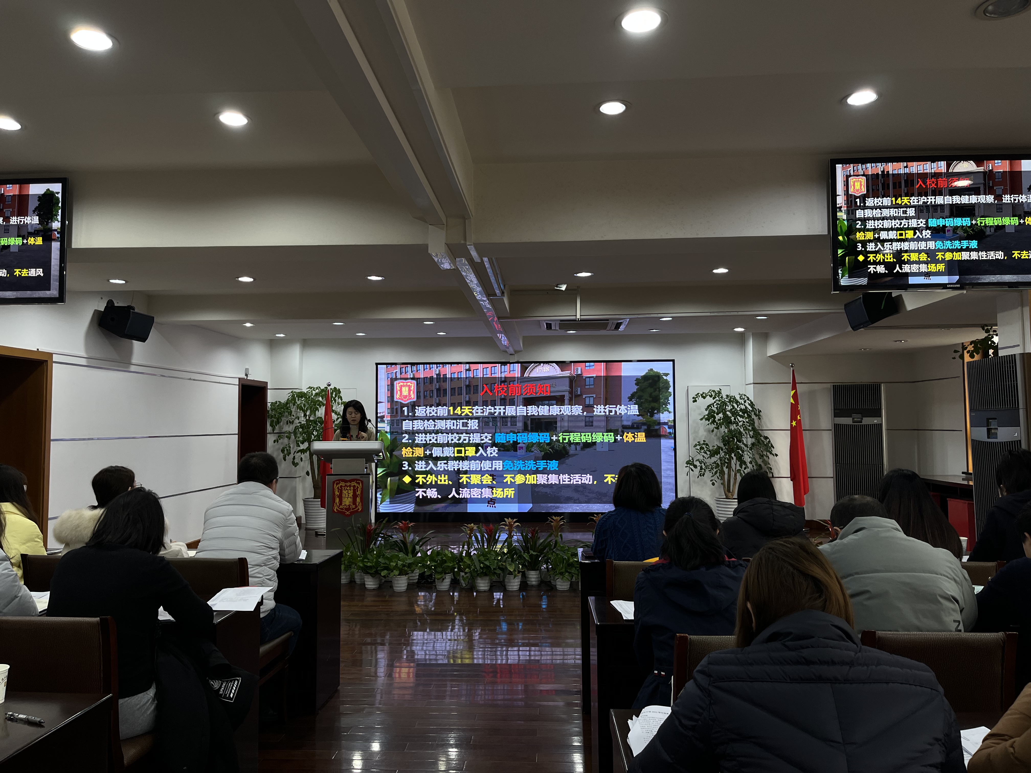 首先,通过寒假期间中高风险地区的变化,强调了疫情防控工作要坚持长期抓、时时抓。对一日三报、体温检测、发热应急处置等重要防疫措施进行了应急处置模拟演练和培训。会上肯定了全体班主任在寒假期间对学生离沪人员的动态跟踪及全体学生的每日晨报的辛苦付出。之后,也提出了对于新学期春季新冠疫情等传染性疾病防控的几点要求,每位班主任都要做好掌握一手情况、信息解释沟通、服务保障等日常防疫工作。就师生分时段上下学、个人防护、重要健康巡检内容及爱国卫生运动等方面分别进行了有侧重度的强调,并对每日开窗通风及教室突发呕吐情境做了现场重要事项提示及模拟练习,本学期继续执行发热师生症状消失后48小时入校,呕吐腹泻师生症状消失72小时入校的防疫要求,进一步强调了新一轮的疫情防控形势下新学期防疫工作的首要性、必要性及关键性。