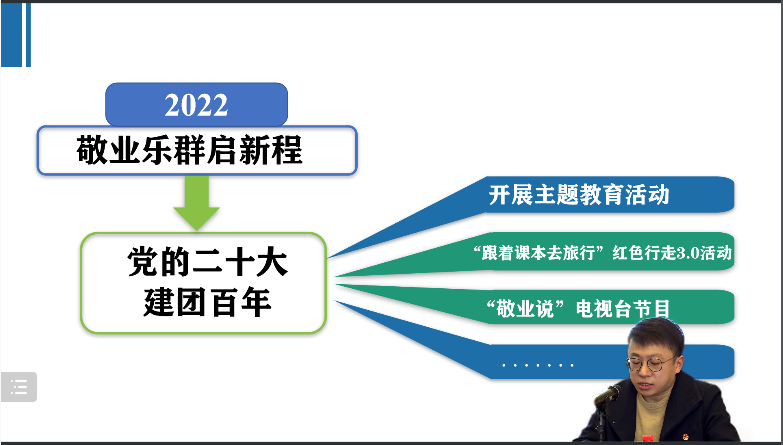 3月10日上午,团黄浦区委三届八次全会在团区委机关举行,会议还通过视频系统同步线上召开,出席会议的领导有团区委书记董磊,团区委副书记王启洋、褚巍巍、李依以及团区委委员全程参与全会。我校团委作为区教育系统连续两年获得“红旗团组织”的基层团组织代表,受邀参与全会并作交流发言。区教育团工委委员、校团委书记陆俊杰围绕2022年的工作重点做了《传承“敬业乐群” 促进“和谐发展”》的汇报,团结、带领广大团员青年,加强组织建设、思想建设工作,开展丰富活动,注重培养团员青年的服务意识、服务能力,以实际行动迎接党的二十大胜利召开,始终坚定“党旗所指就是团旗所向”,秉持“敬业乐群”校训开启新的征程!