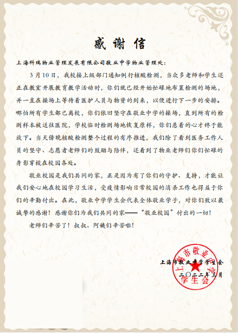 校学生会致物业老师们的一封感谢信,有你们真好!