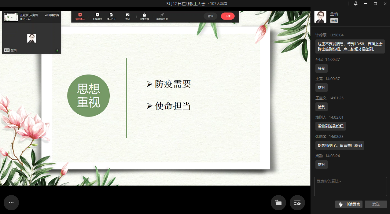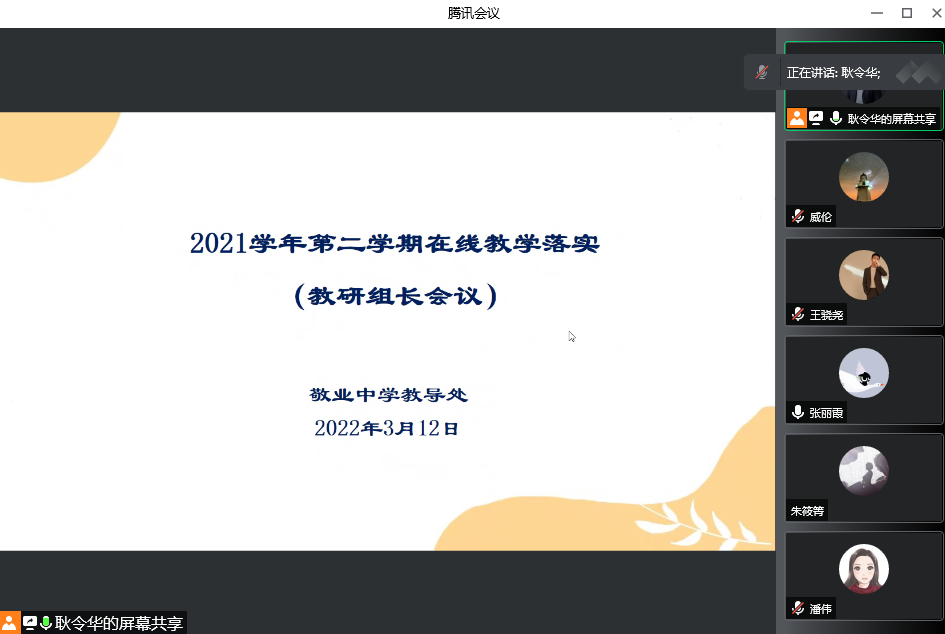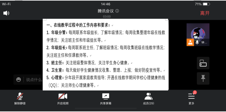 3月12日下午,通过线上形式召开全体教职工大会,校长金怡对在线教学相关工作进行部署、党总支书记马伟进一步明确在线教学关注要点以及教学教导耿令华就在线教学具体安排做了说明。教工大会之后,各个教研组、年级组为确保教学工作扎实、有效推进,及时线上开展教研组、备课组、年级组会议,进一步落实会议相关要求,同时通过线上会议形式,做好平台和相关设备的调试工作。