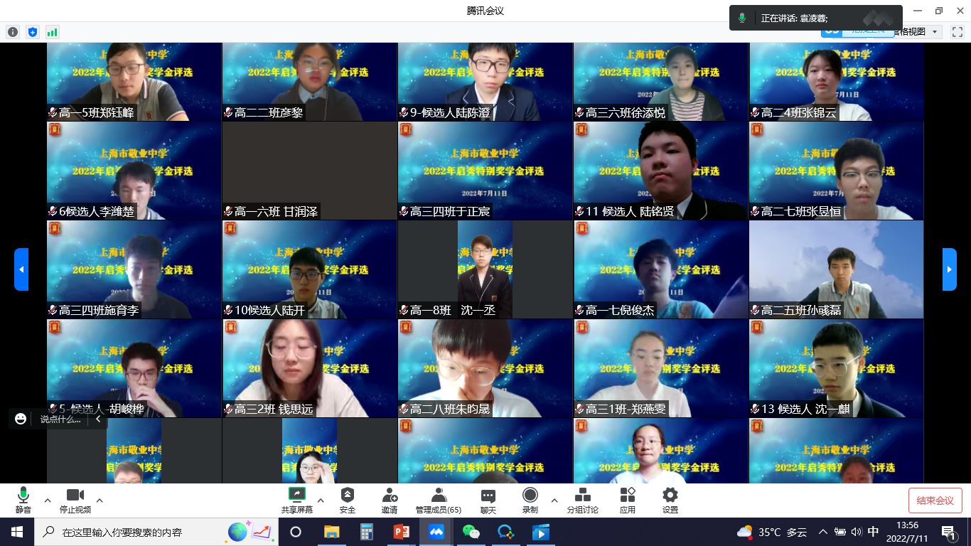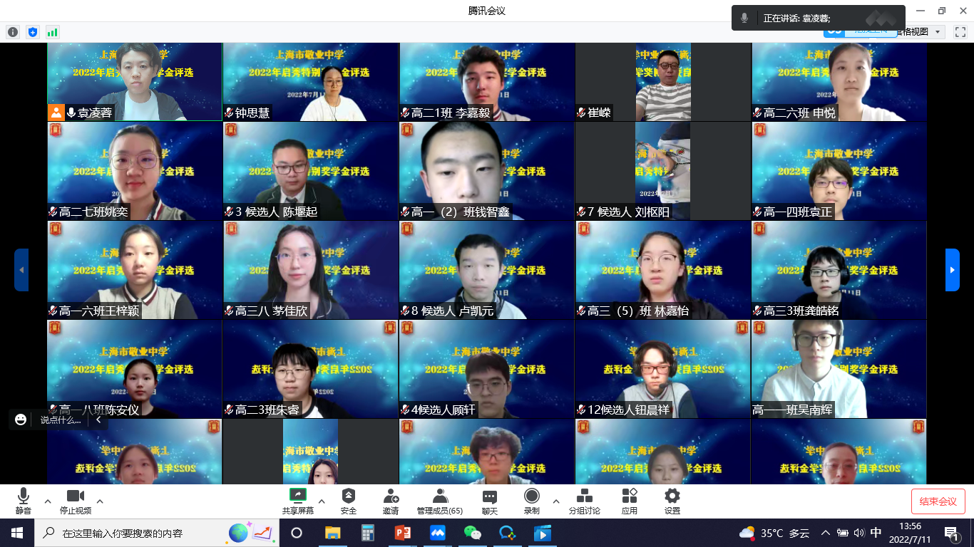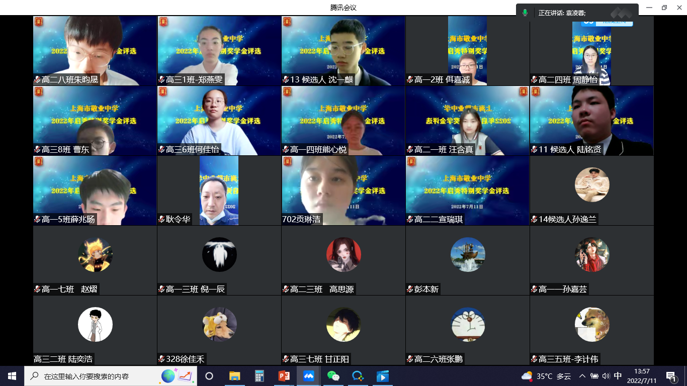 7月11日下午,2022年启秀特别奖学金评选活动于腾讯会议拉开帷幕,来自三个年级的15位参评候选人、奖学金委员会教师评委和基层班级学生评委们,共计近70人,共同参与了本次线上云评选。