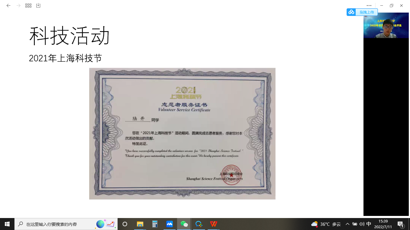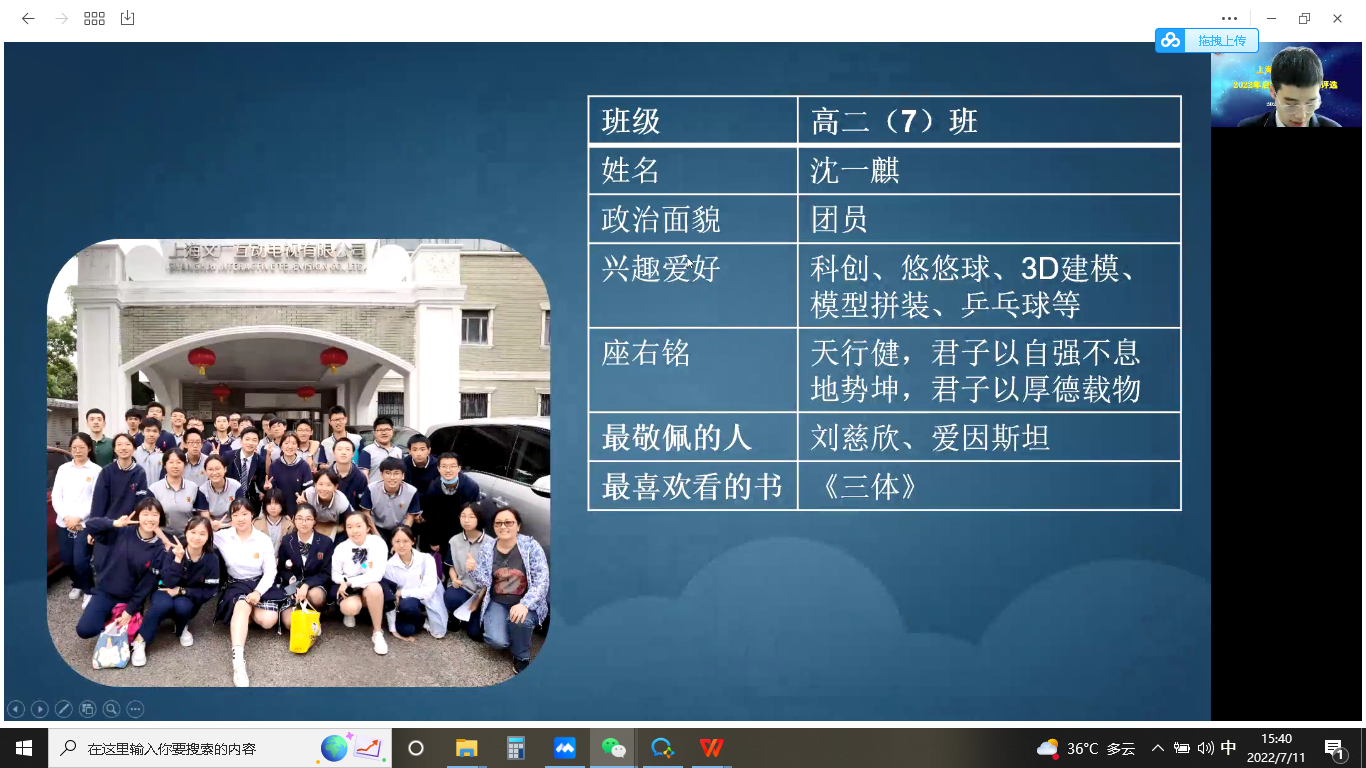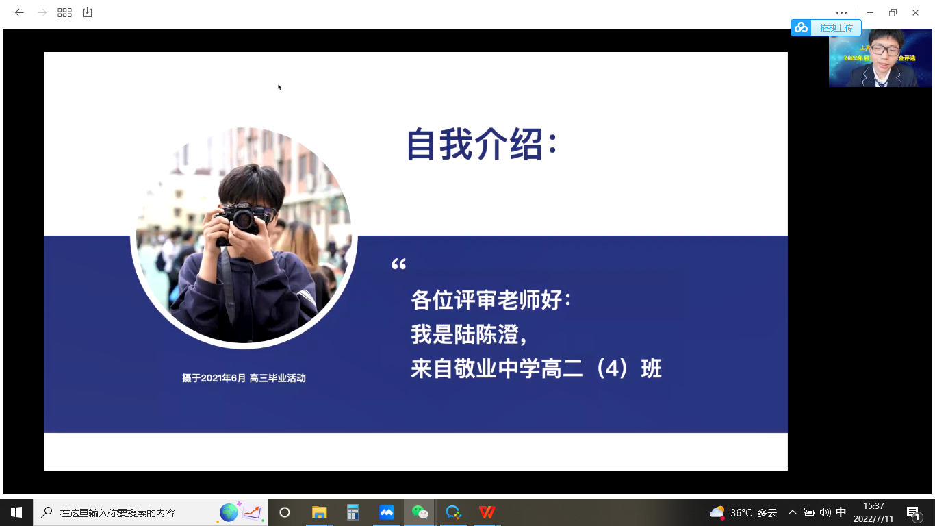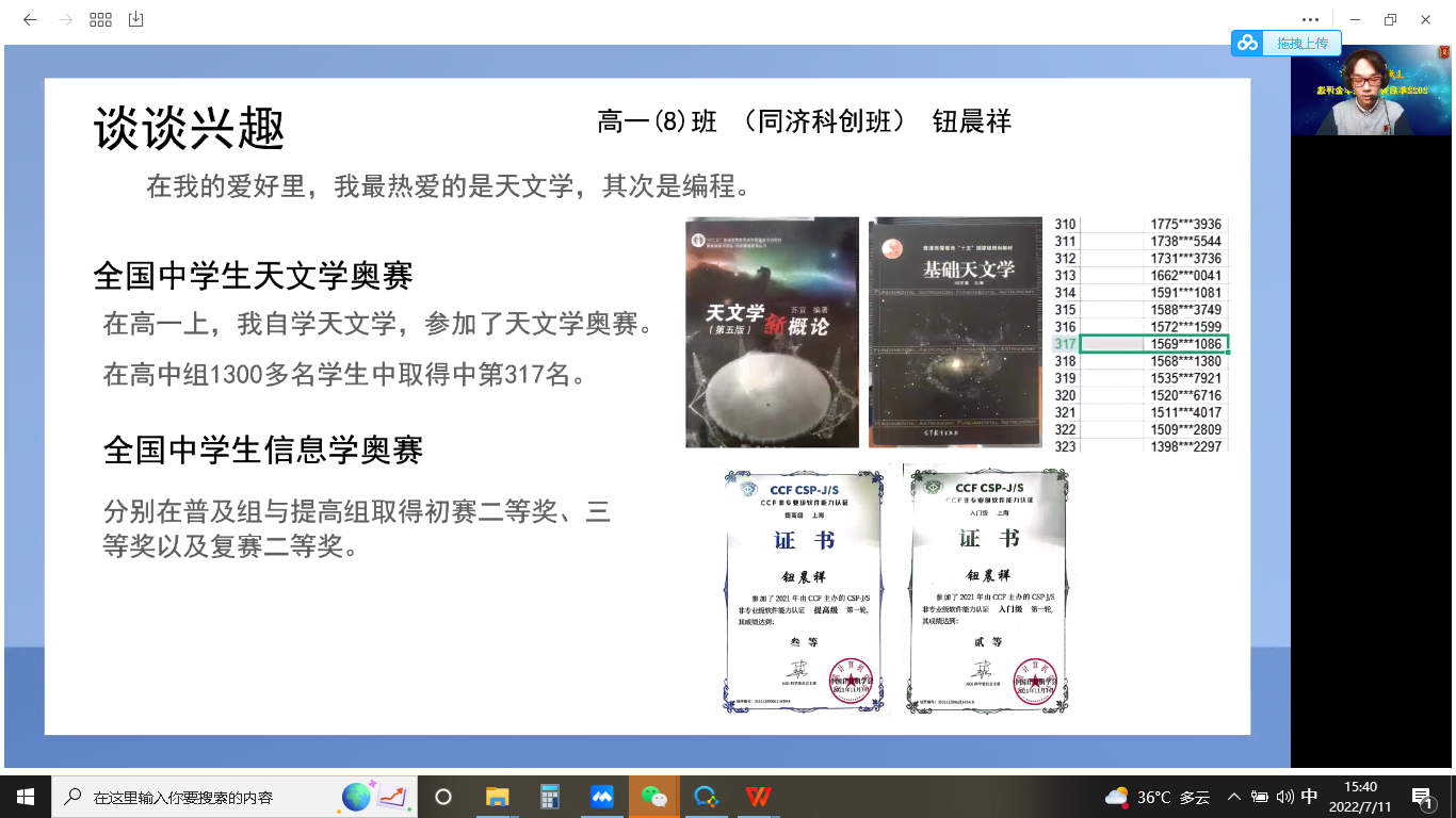 7月11日下午,2022年启秀特别奖学金评选活动于腾讯会议拉开帷幕,来自三个年级的15位参评候选人、奖学金委员会教师评委和基层班级学生评委们,共计近70人,共同参与了本次线上云评选。